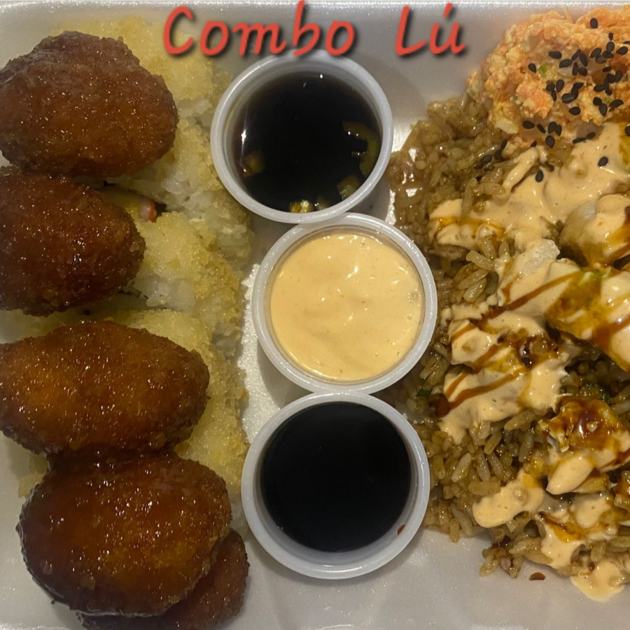 Arroz frito, deliciosos boneless (salsa a elegir) aguacate, philadelpia, ensalada surimi y ajonjoli
