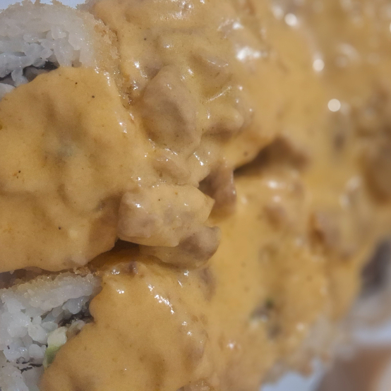 Por dentro carne de res y camarón, aguacate, philadelpia, pepino por fuera ligeramente queso gratinado con aderezo spicy