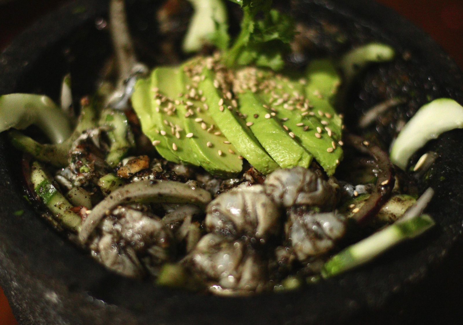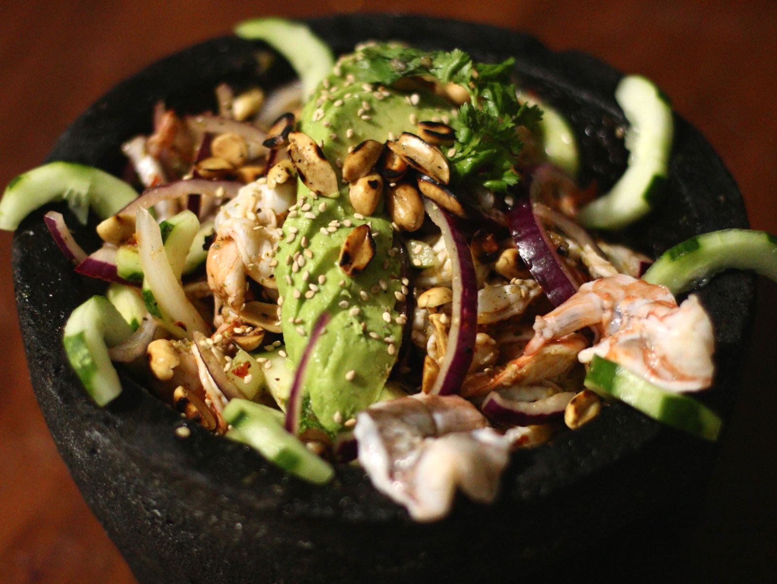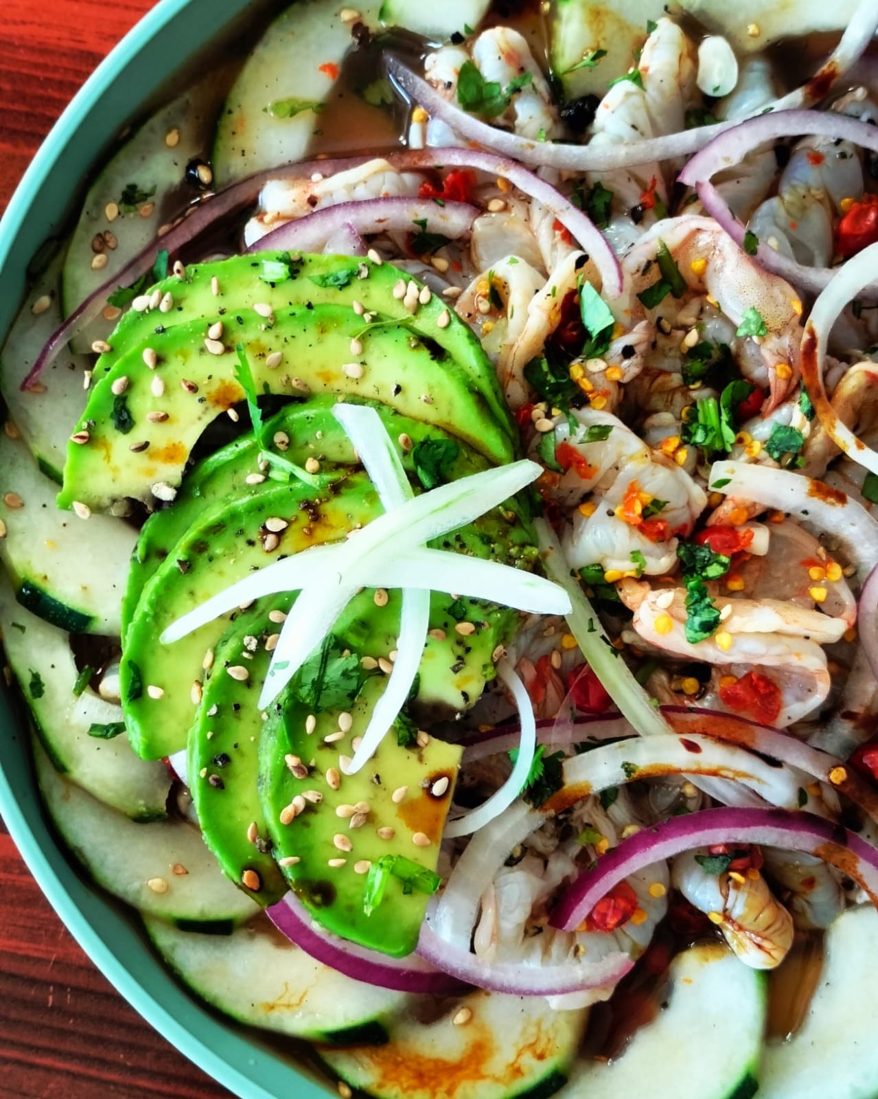 Camarón curtido y marinado en pimienta, cebolla, pepino y aguacate.