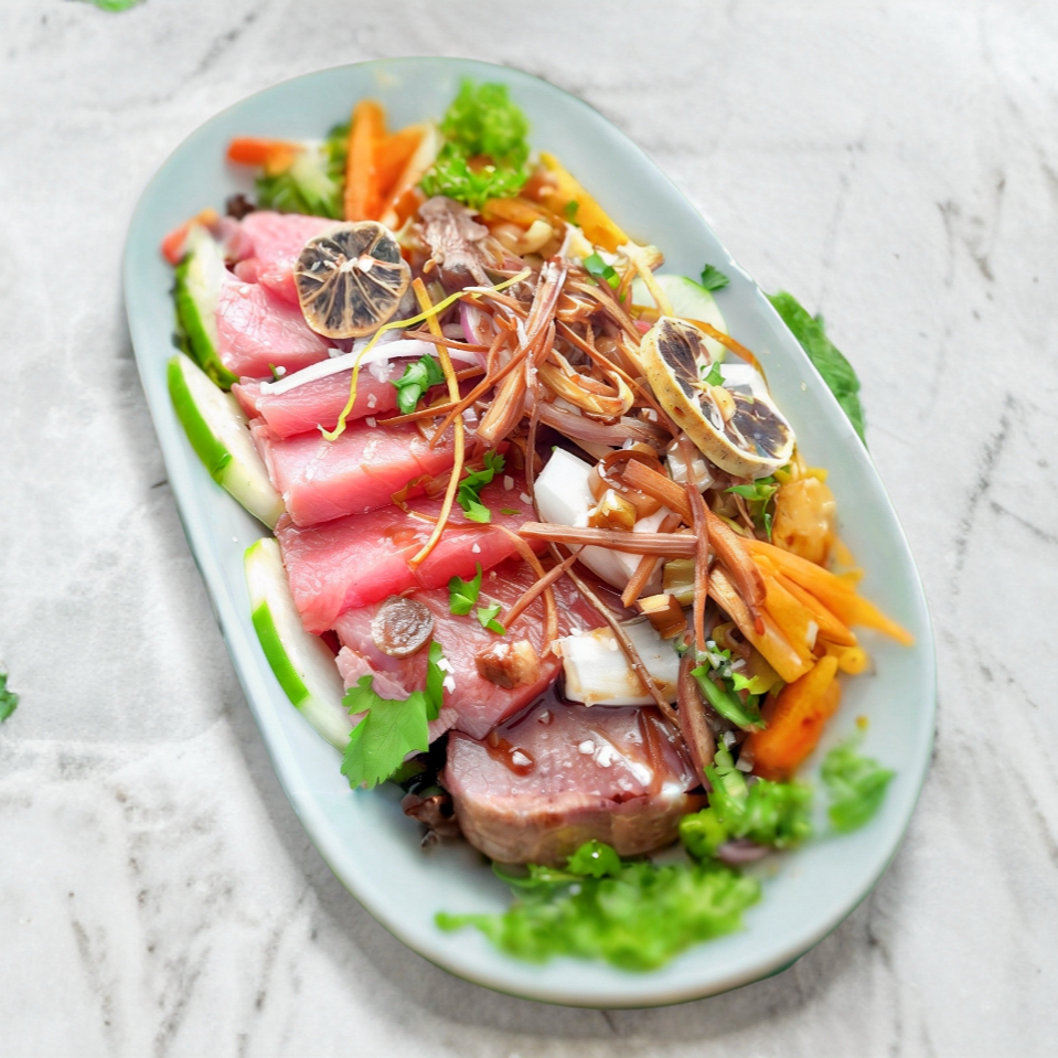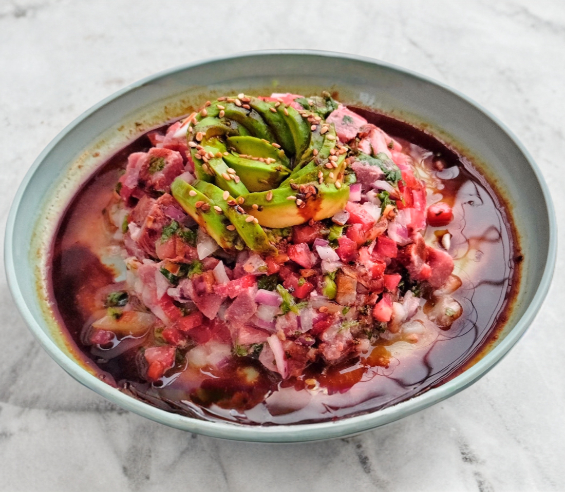 Atún en trocitos curtido, salsa mexicana y aguacate.