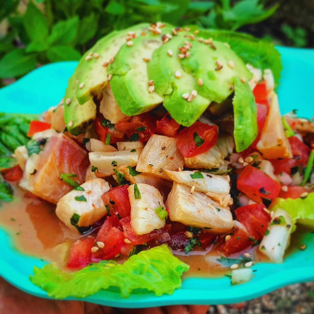 Camarón y pescado en trozo curtido, salsa mexicana y aguacate.