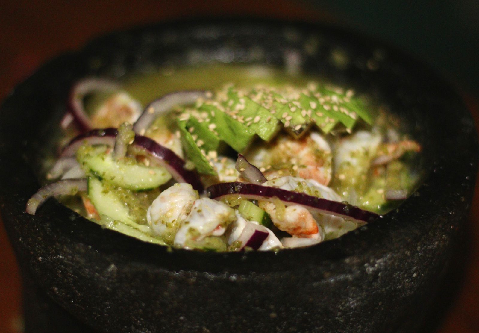 Camarón curtido y bañado con salsa verde de serrano, cebolla, pepino y aguacate.