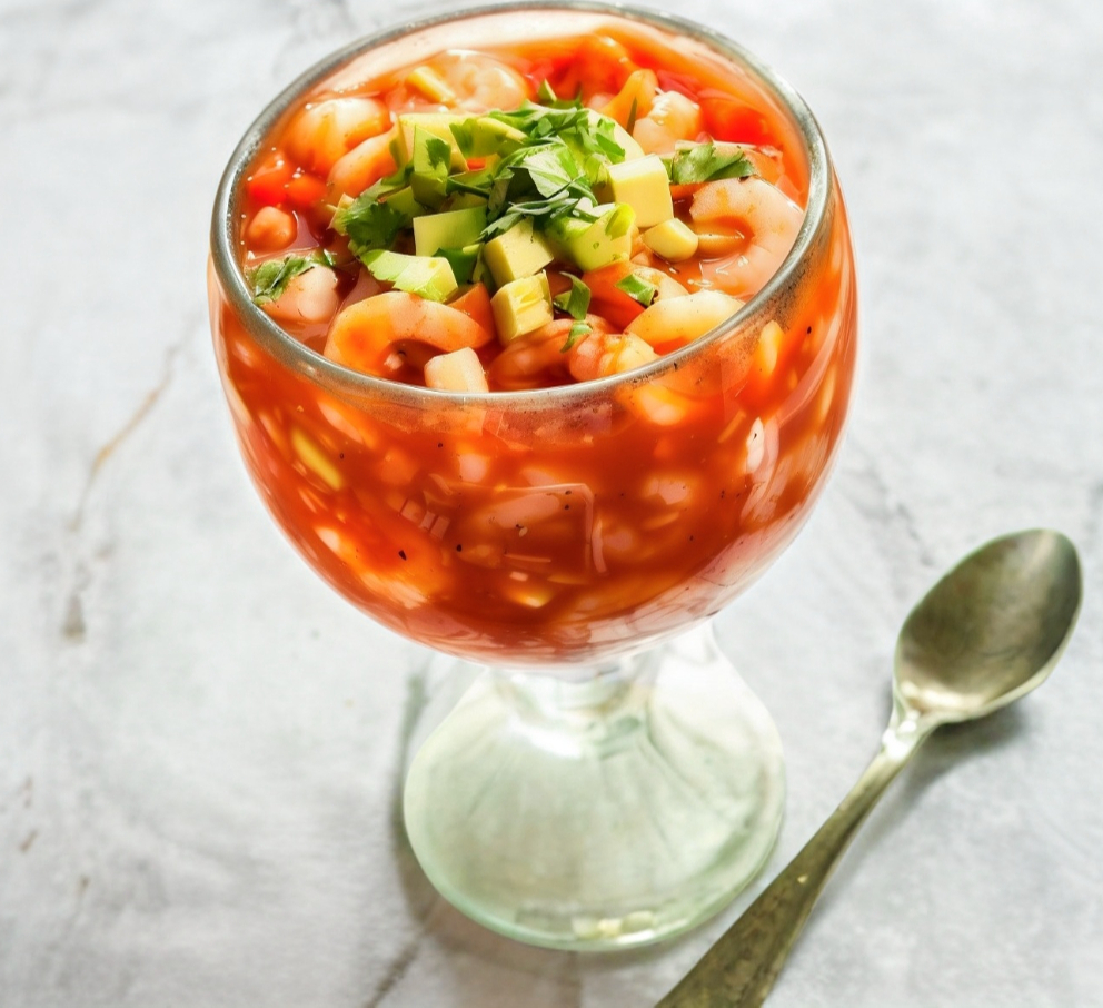 Consomé con camarón, pulpo, salsa mexicana y aguacate.