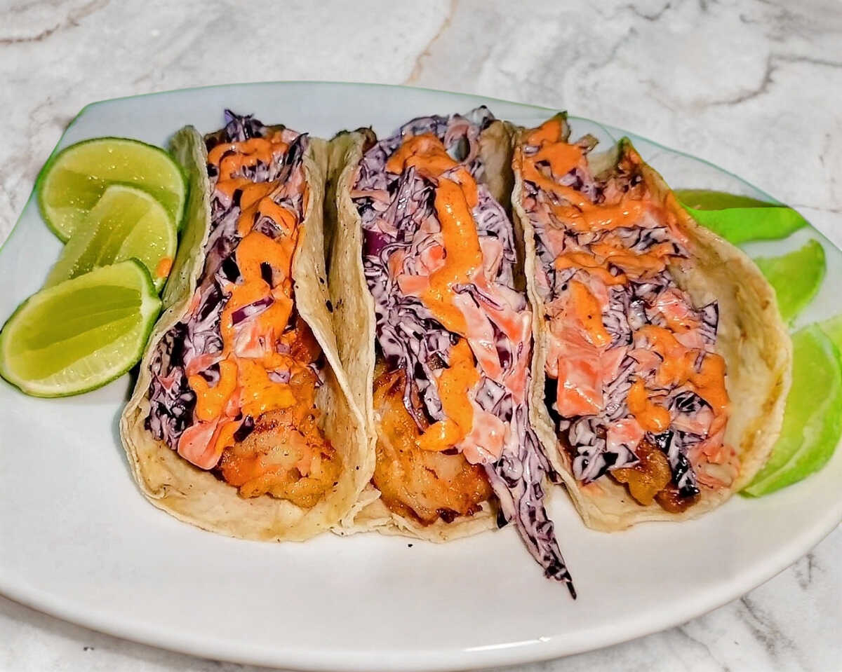 Disfruta de 3 tacos rellenos de camarón, con aproximadamente 200 g de camarón tierno y jugoso. Acompañados de salsa picante y mexicana, que se sirve aparte para que puedas ajustar el nivel de picante a tu gusto.