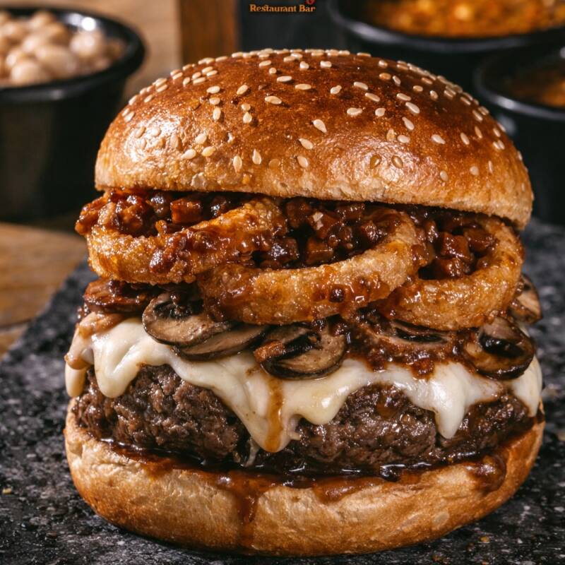 Carne, champiñones salteados con mantequilla, queso mozzarella, aros de cebolla, salsa de tocino y verdura acompañadas con papas a la francesa