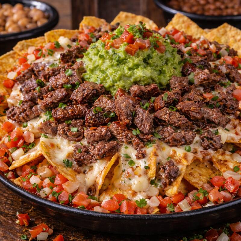 Queso mozzarella, guacamole, pico de gallo carne rib eye