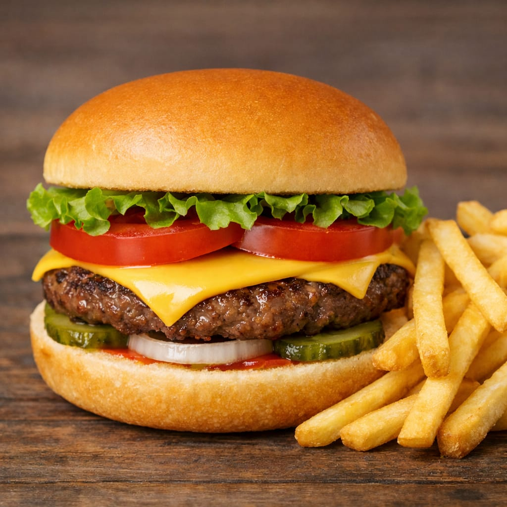 Carne, queso amarillo, jitomate, cebolla acompañado de papas a la francesa