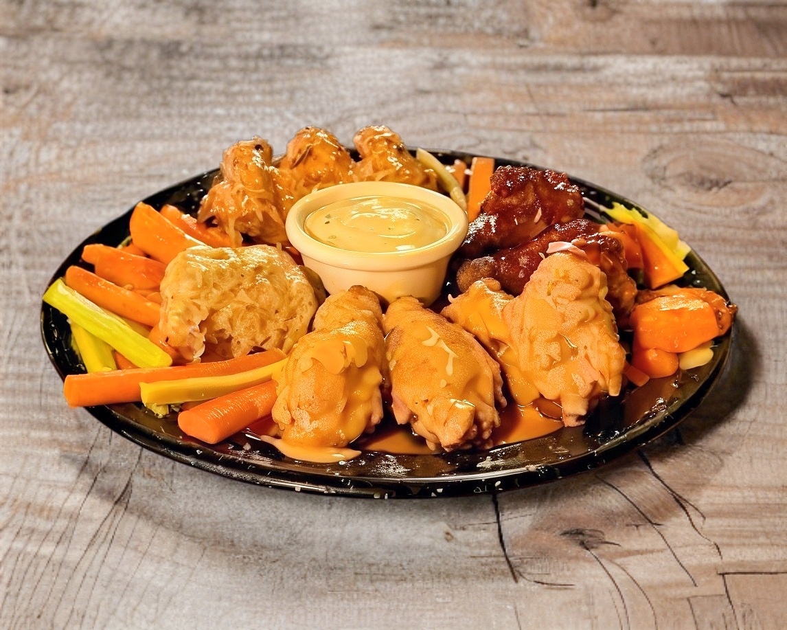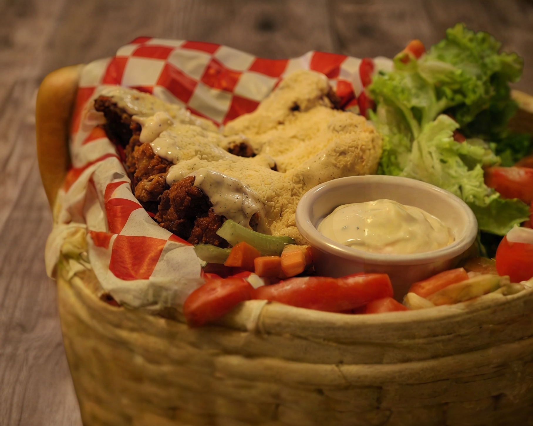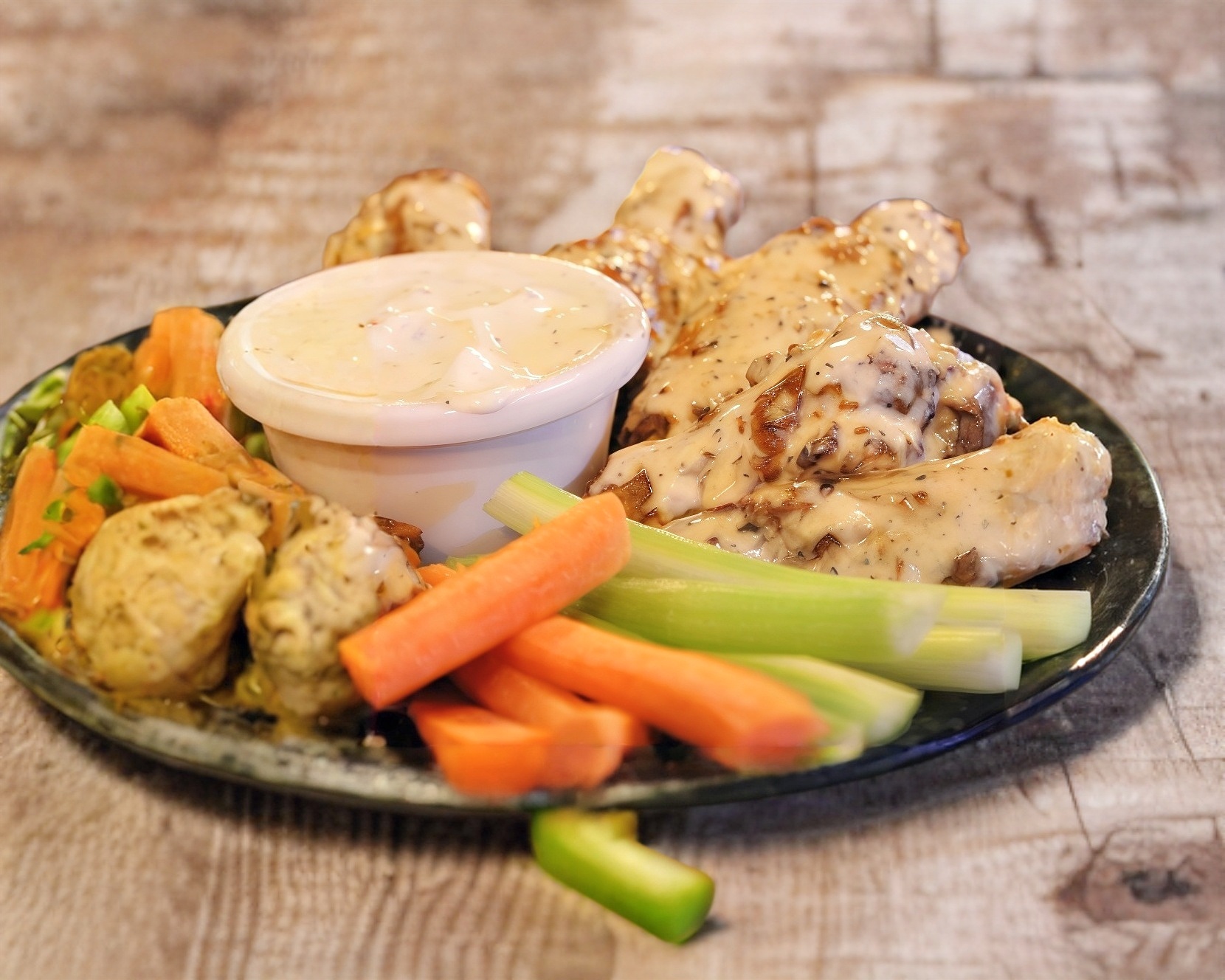 Alitas fritas bañadas con nuestro aderezo ranch de la casa y bufalo cremoso, acompañado de aderezo ranch de la casa y vegetales (zanahoria y apio)