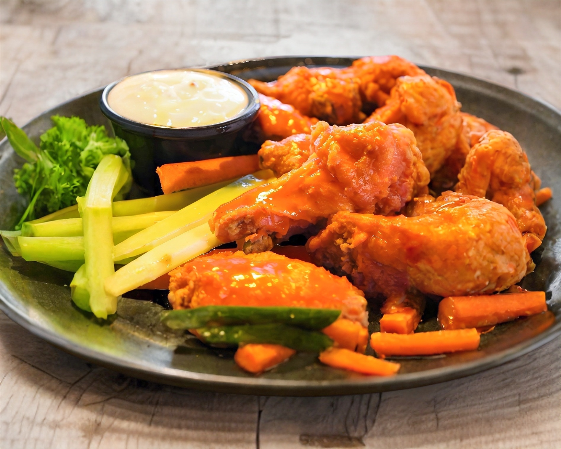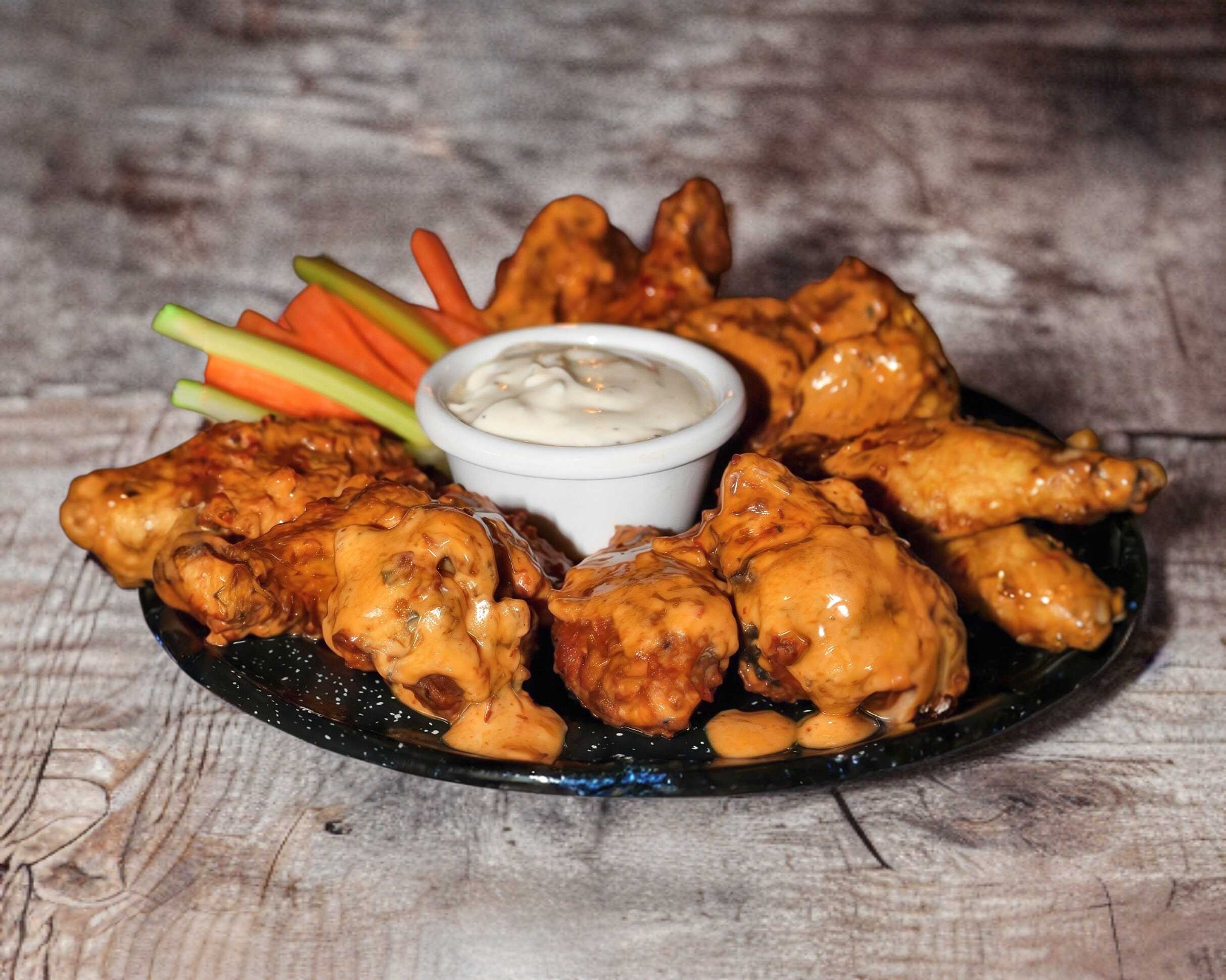 Alitas fritas bañadas con una mezcla de salsa búfalo y chile serrano, acompañado de aderezo ranch de la casa y vegetales (zanahoria y apio)