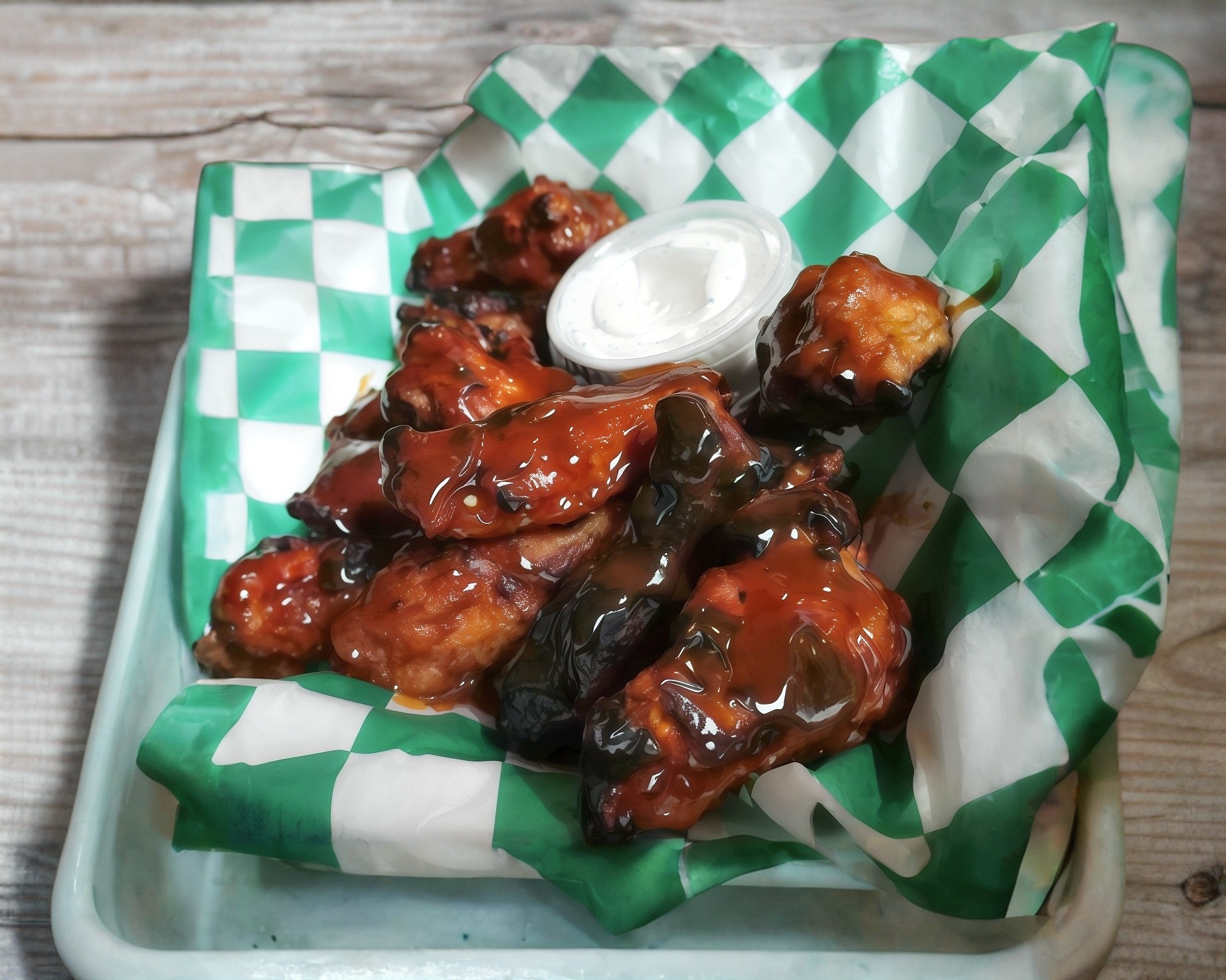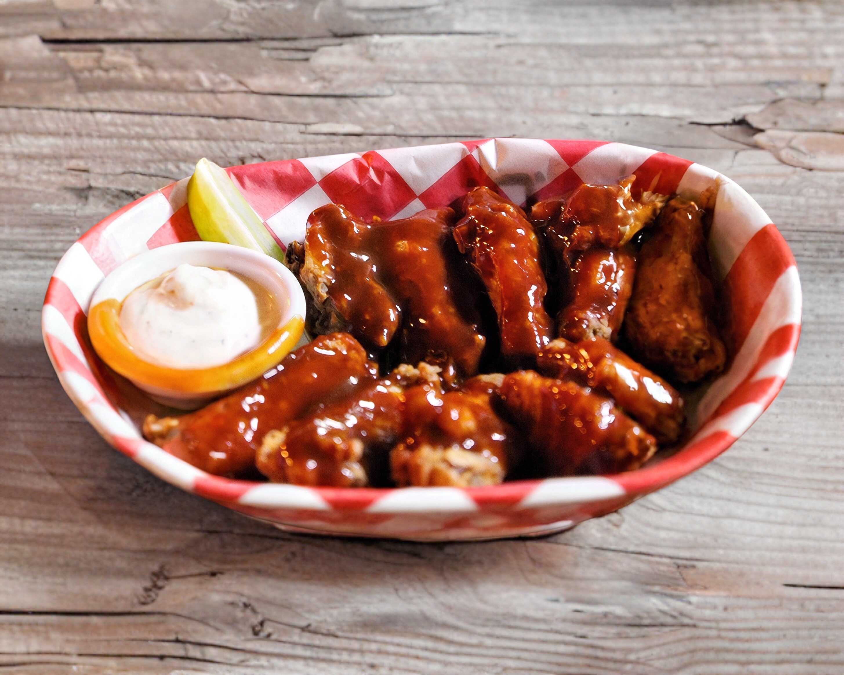 Alitas fritas bañadas con una combinación de salsa BBQ y salsa valentina, acompañado de aderezo ranch de la casa y vegetales (zanahoria y apio)