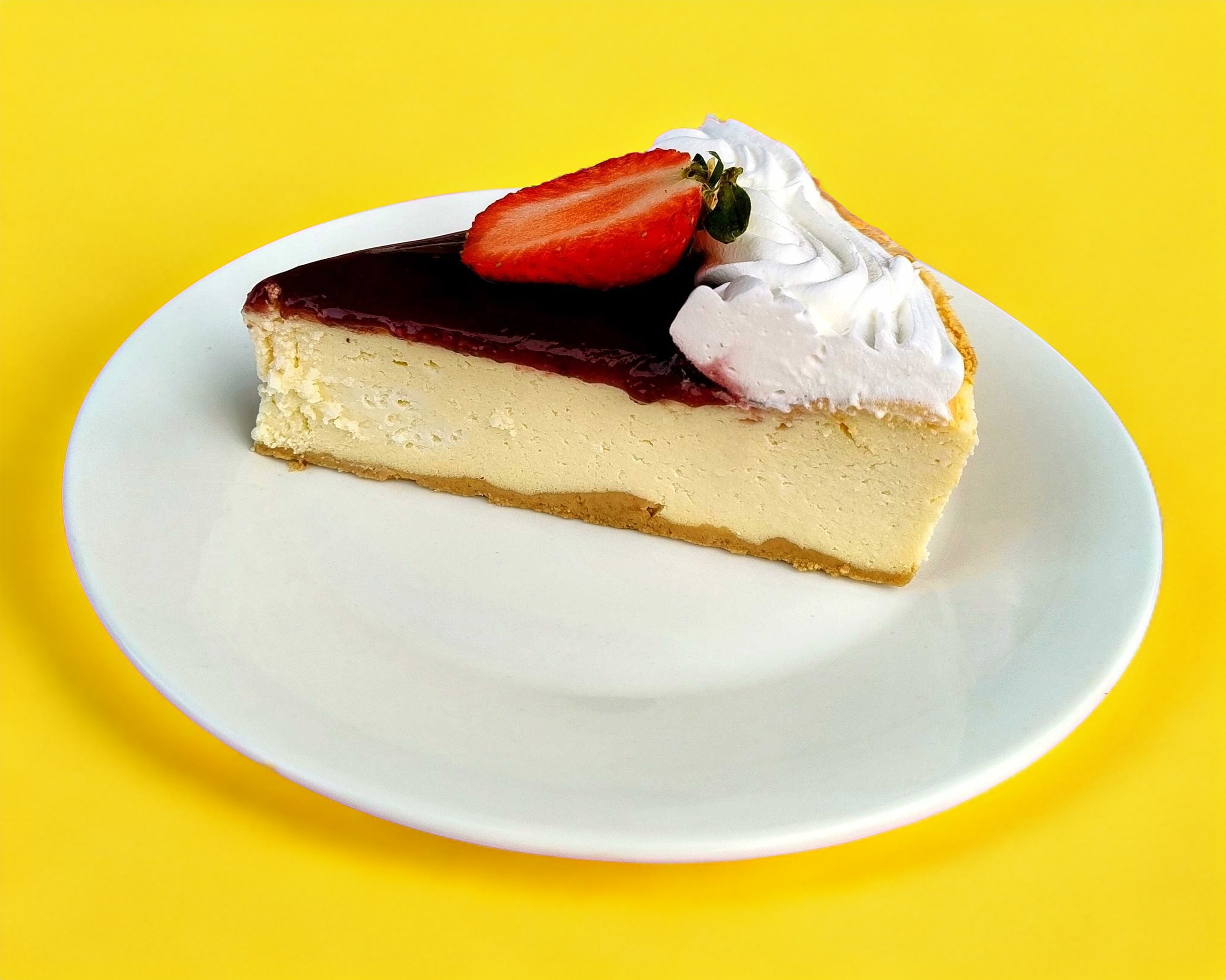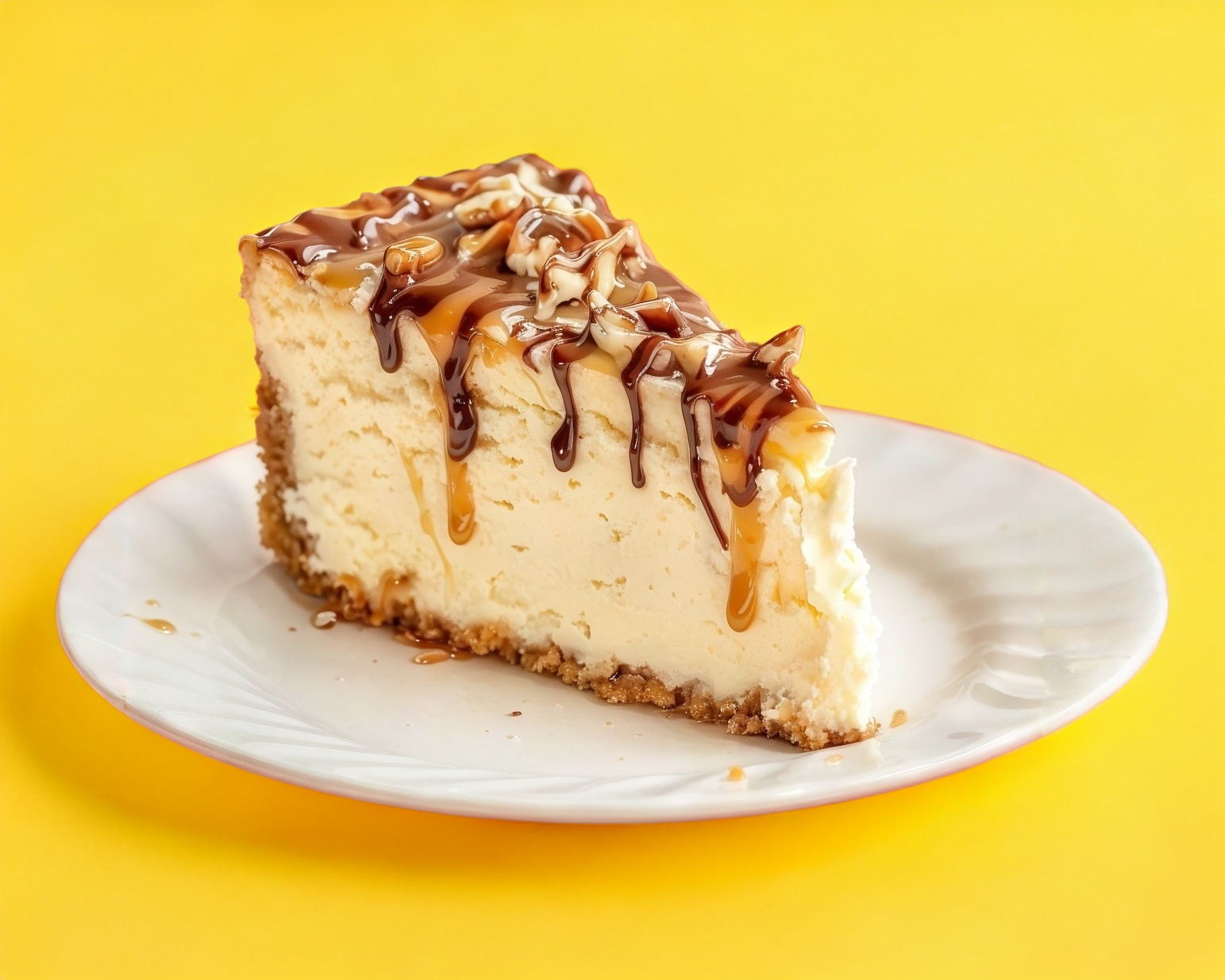 1 Rebanada de Cremoso chessecake con topping de chocolate y nuez.