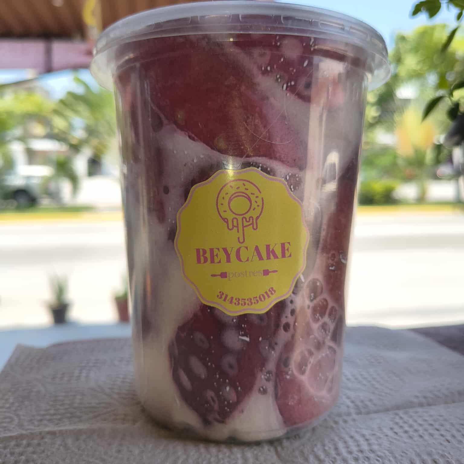 Fresas naturales con crema especial de la casa y trozos de pay.