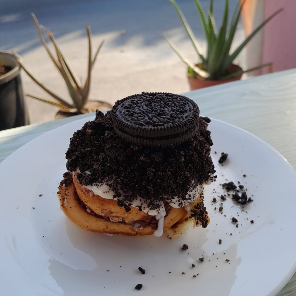 Rol de canela cubierto de glaseado de queso crema y galleta oreo.