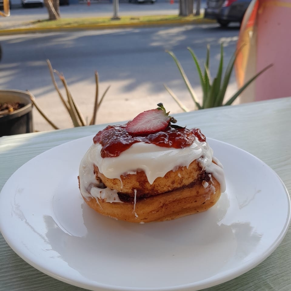 Rol de canela cubierto de glaseado de queso crema y mermelada de fresa