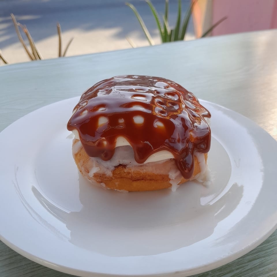 Rol de canela cubierto de glaseado de queso crema y cajeta.