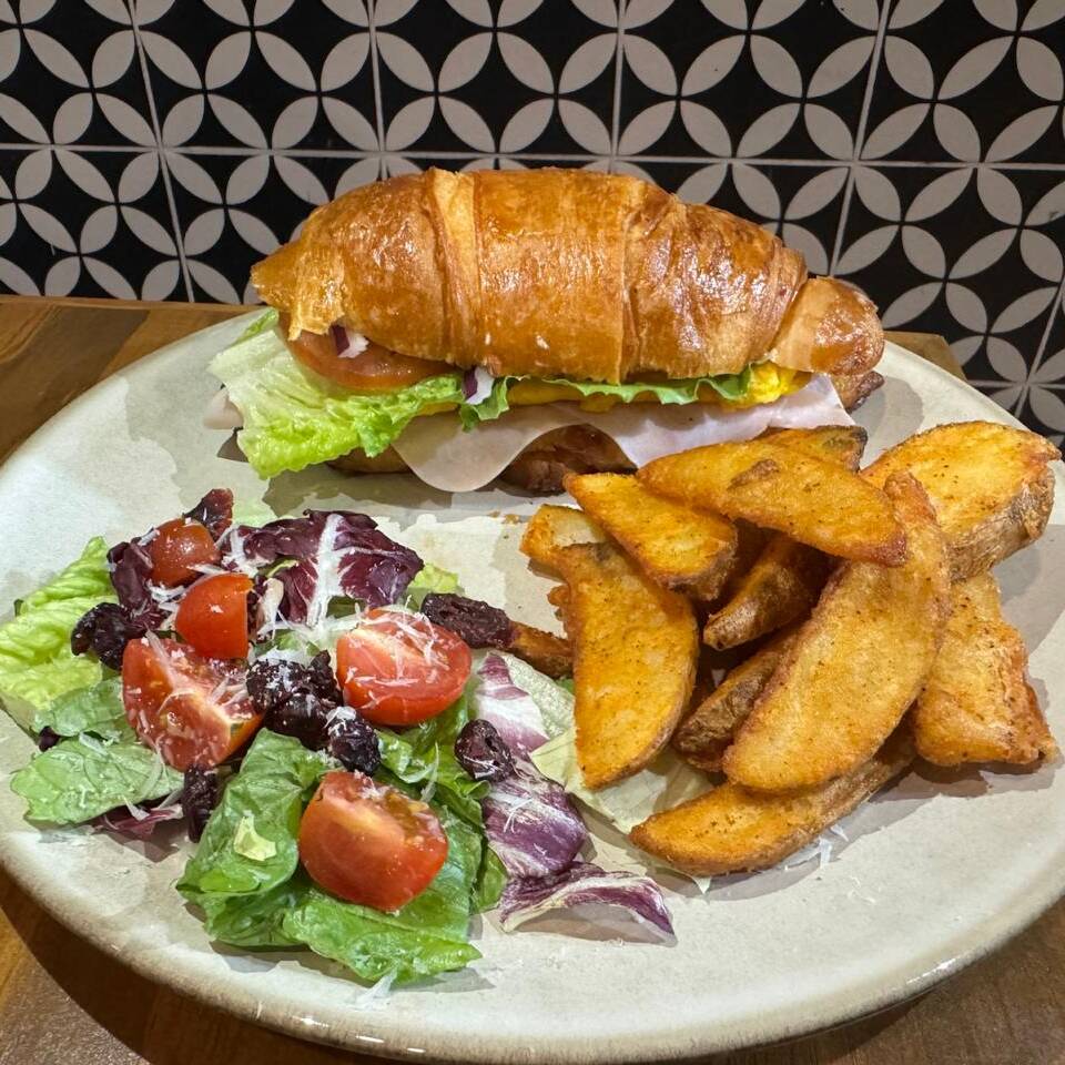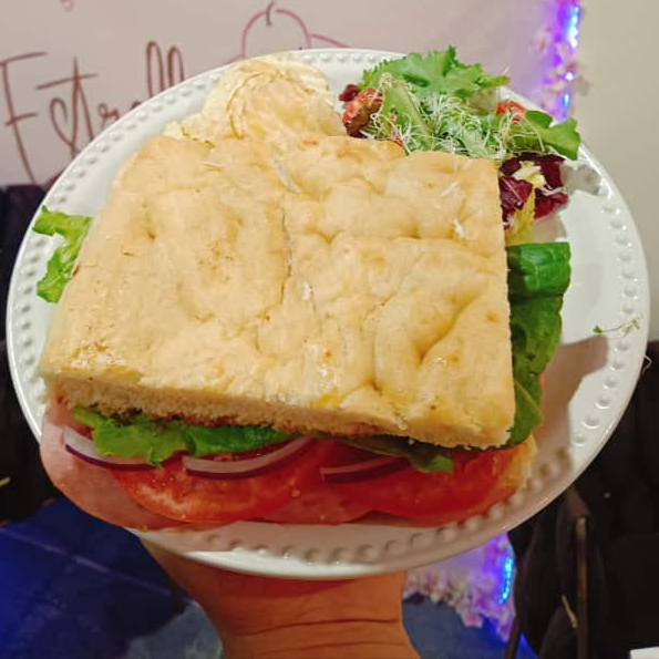 Pan de masa madre (de la casa), con pechuga de pavo, salami, mozzarella, tomate y mayonesa de la casa. Acompañada de papas chips y ensalada.