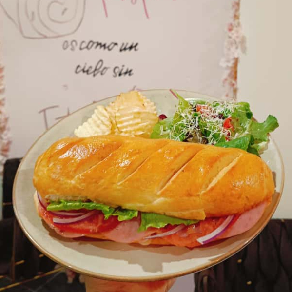 Pechuga de pavo, salami, queso cheddar, lechuga, tomate y mayonesa de la casa. Acompañados de papas chips y ensalada.