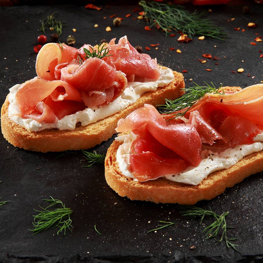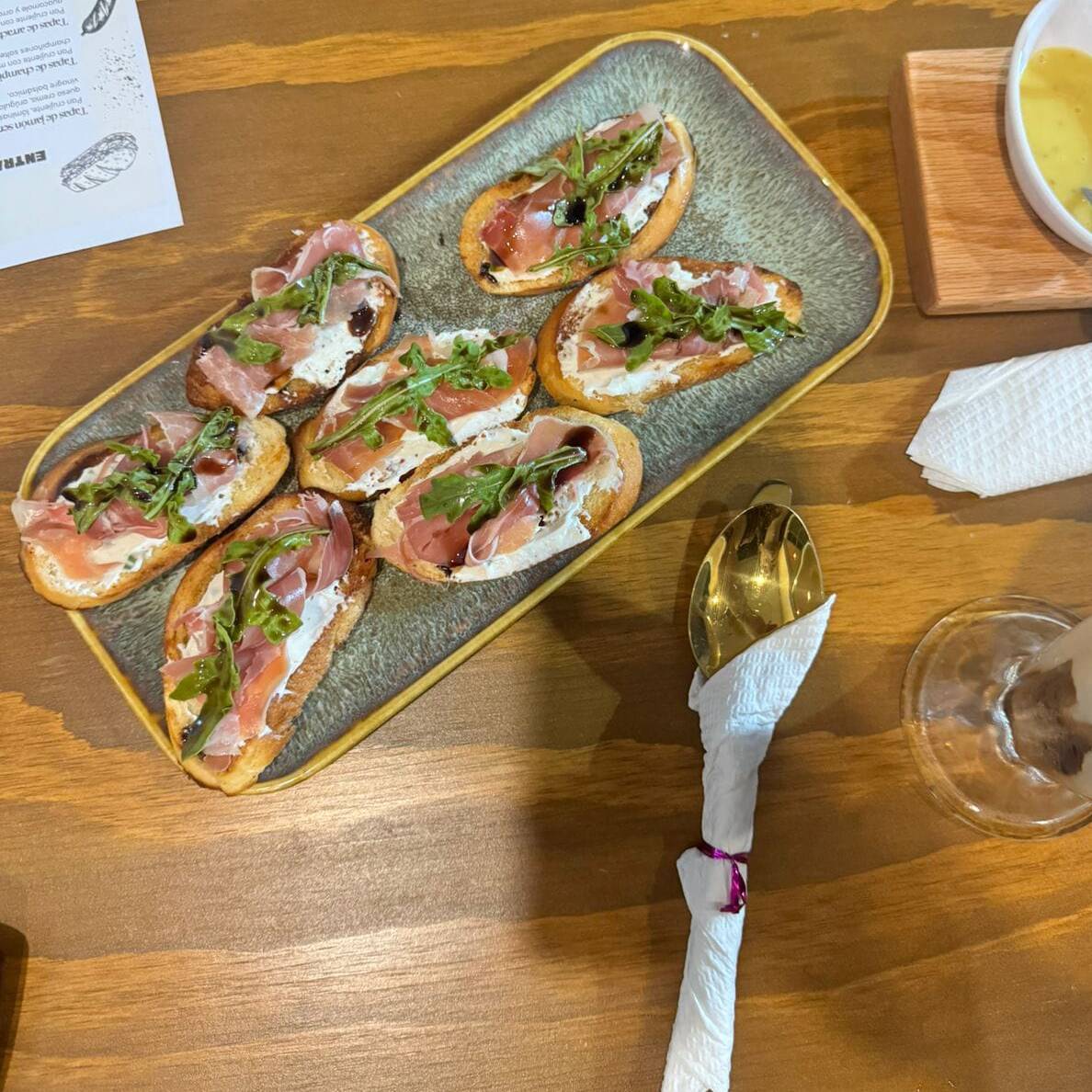 Pan crujiente, con láminas de jamón serrano, queso crema, arúgula, y reducción de vinagre balsámico.