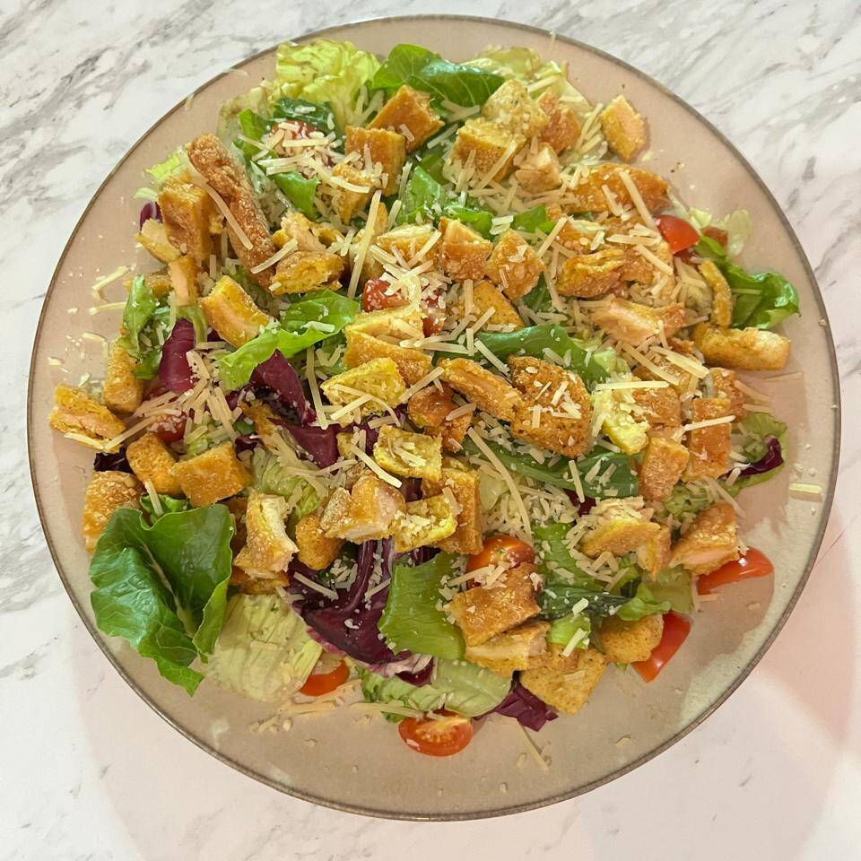 Mix de hojas, pollo a la parrilla, queso parmesano, jitomate cherry, crotones y aderezo.