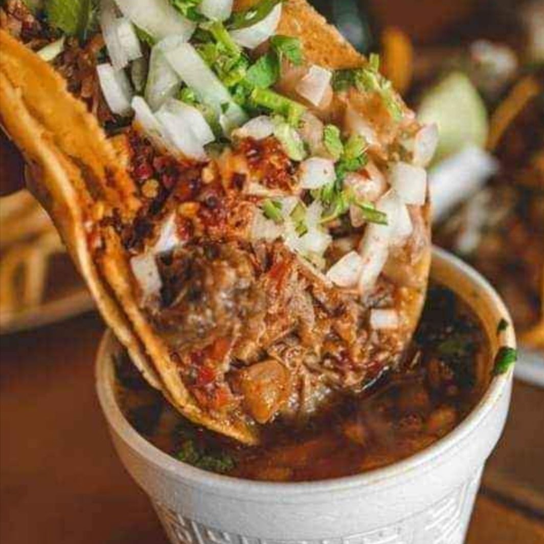 apartir de 3 A 6 tacos agregamos 1 consomé GRATIS se acompaña de cebolla, cilantro, pepino, cebollita guisada, salsa tomate, de arbol y limon.