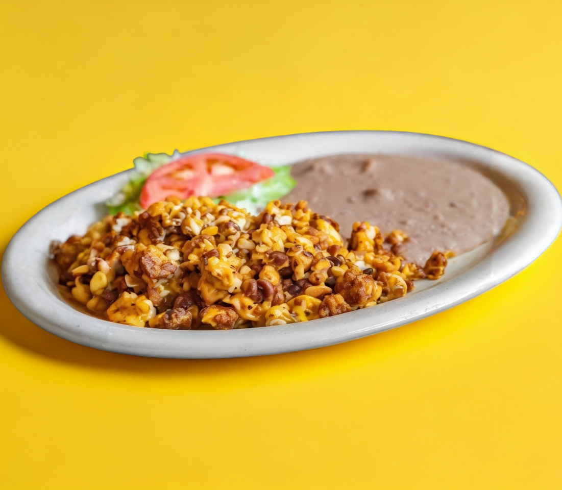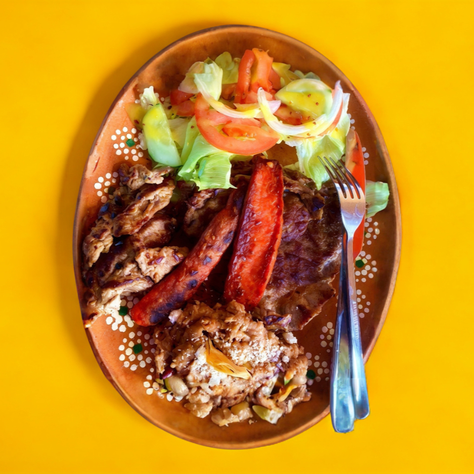 Acompañada de chorizo argentino, frijoles y ensalada.