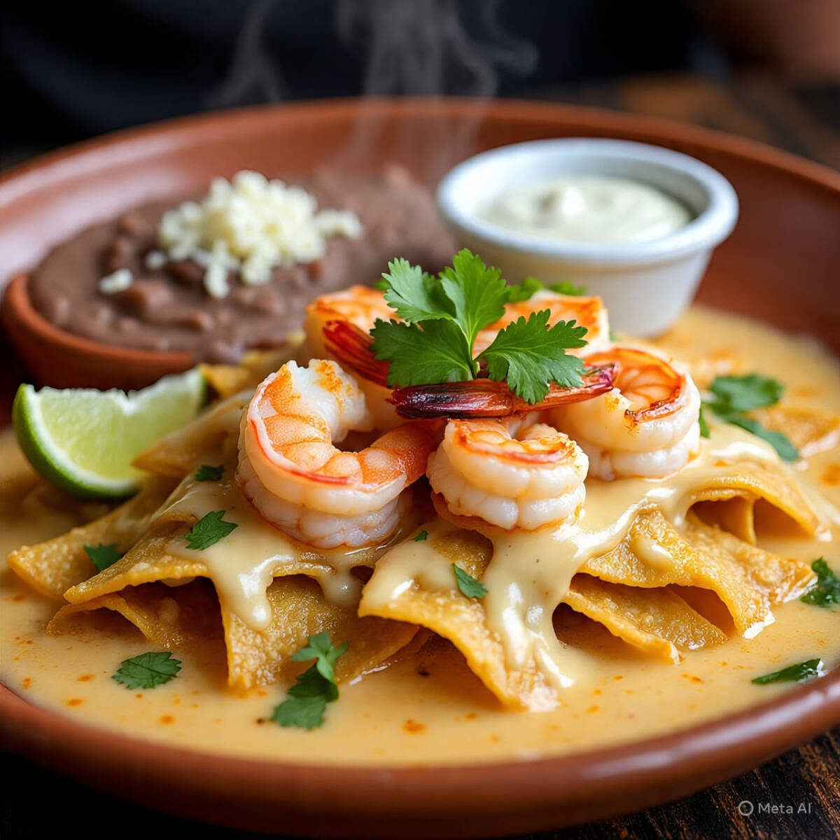 totopo de maiz bañados en salsa de queso con camarones con frijoles crema y cebolla