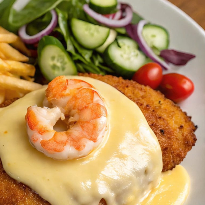 milanesa de pollo bañada en salsa de queso con camarones y arroz y ensalada