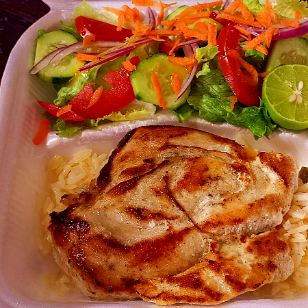 pechuga de pollo con pimiento y cebolla bañada en salsa teriyaky con arroz y ensalada