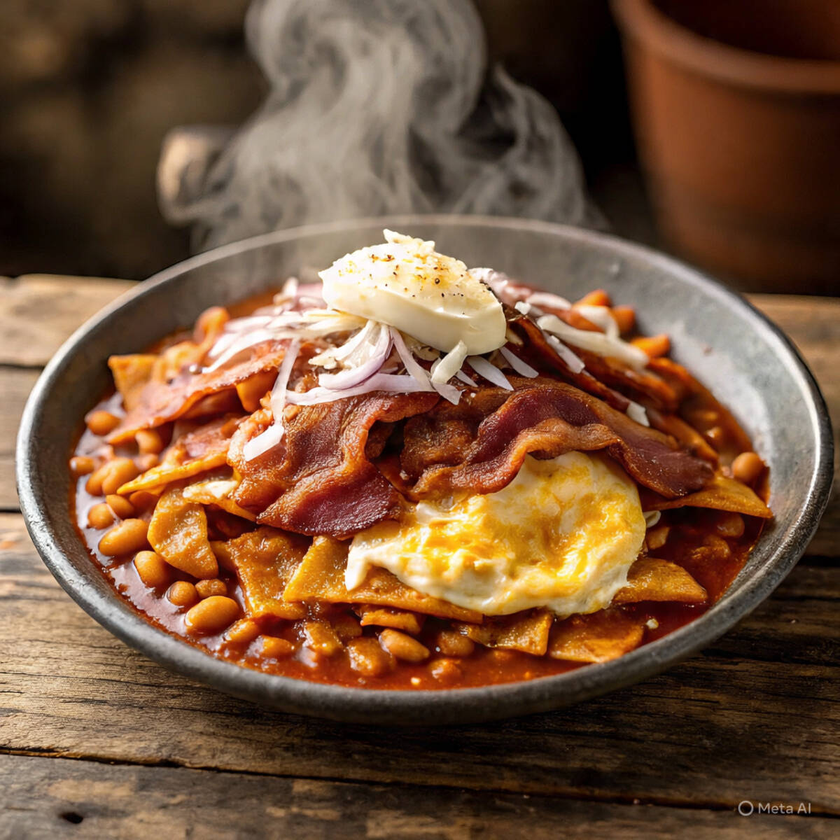 totopo de maiz bañados en salsa roja huevo revuelto tocino frijoles crema y cebolla