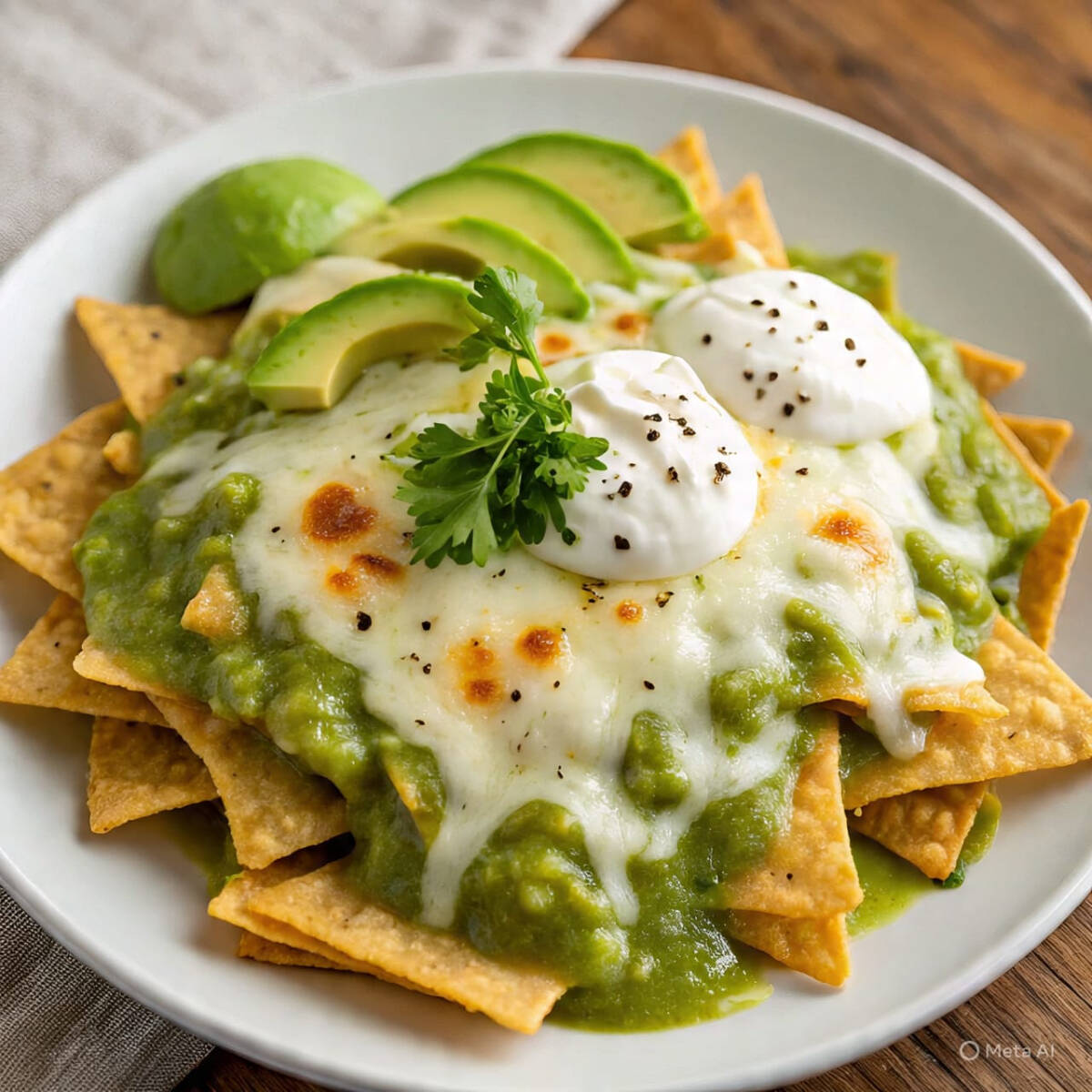 totopo de maiz bañados en salsa verde suiza queso gratinado con pollo frijoles crema y cebolla