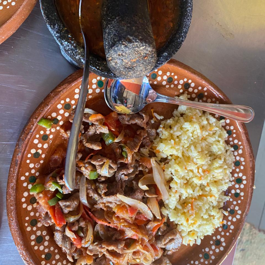 Carne de res cebolla pimiento arroz y tortilla