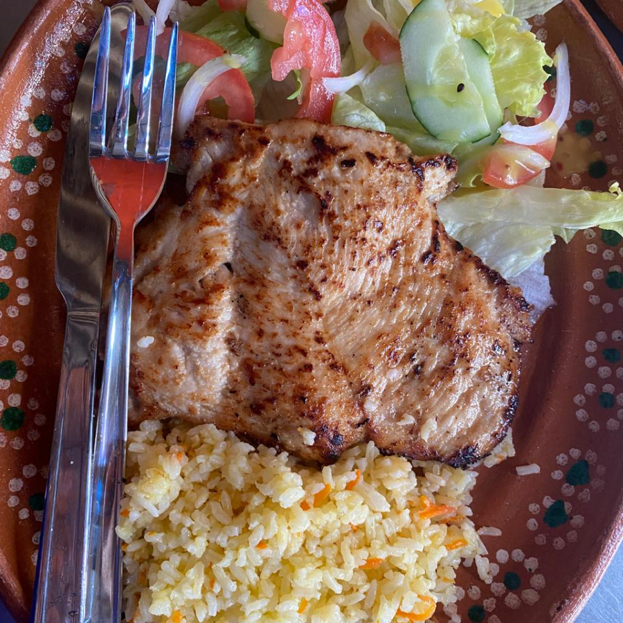 Carne de pollo ensalada verde arroz y tortilla