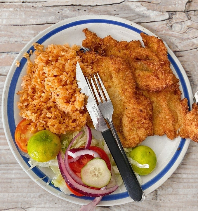 Filete de vela empanizado, con arroz, frijoles y ensalada