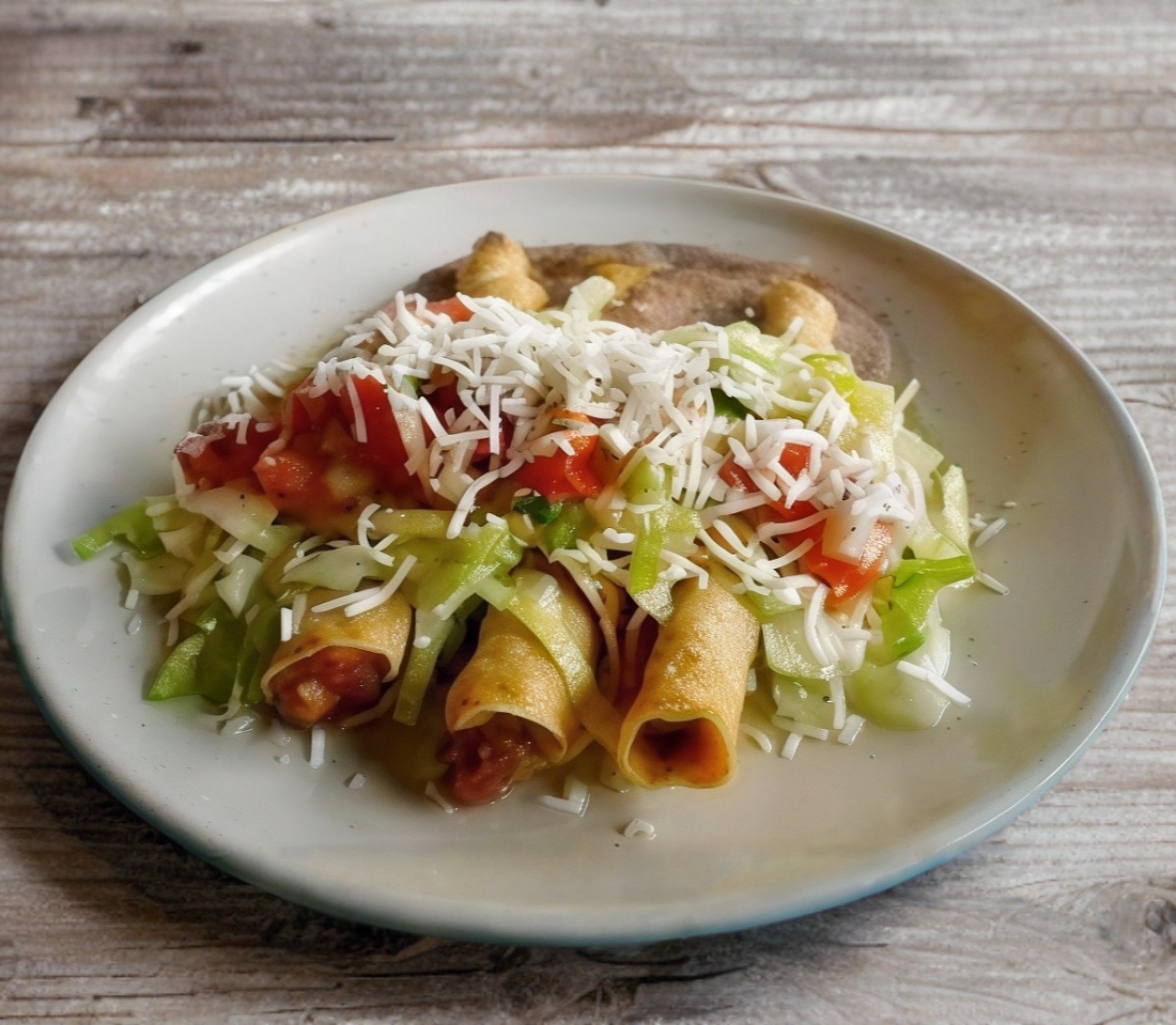 Flautas de pollo guisadas con ensalada crema y queso