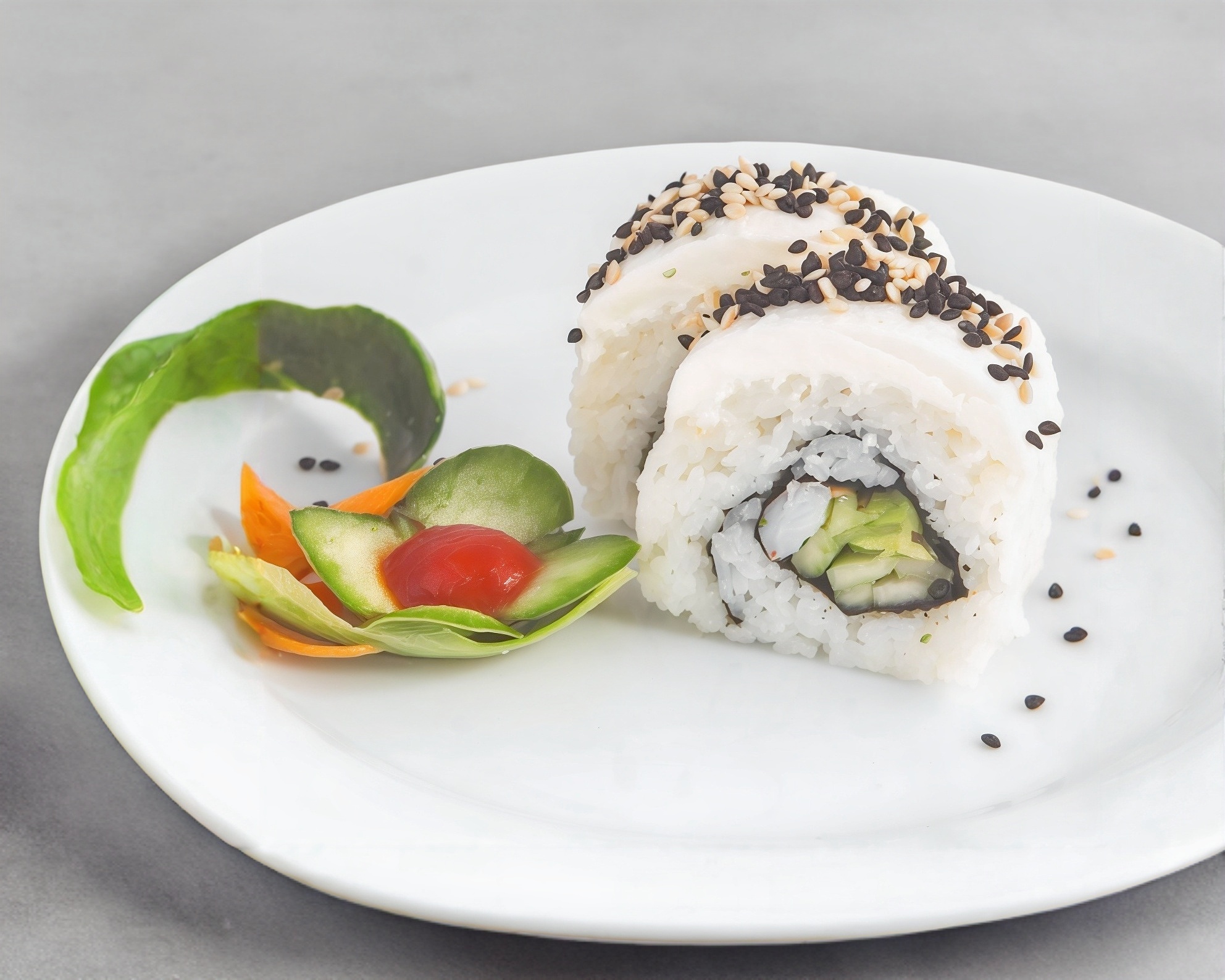 Rollo de 10 piezas, por dentro alga nori, pepino, aguacate, philadelfia, camarón o surimi, por fuera ajonjolí.