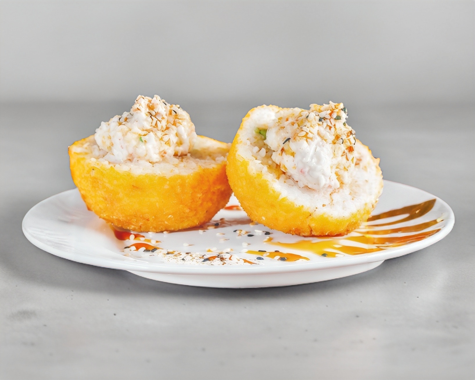 2 Piezas de bolas de arroz empanizadas rellenas de aguacate, philadelfiay salsa de anguila (4 mitades).