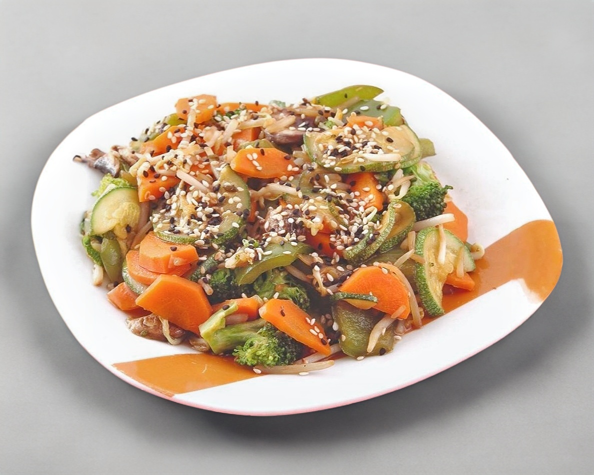 Deliciosa combinación de zanahoria, calabaza, cebolla, pimiento morrón, brócoli, champiñón y germen de soya, acompañado de carne de su elección.