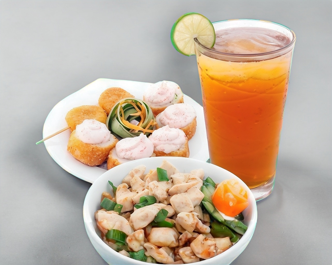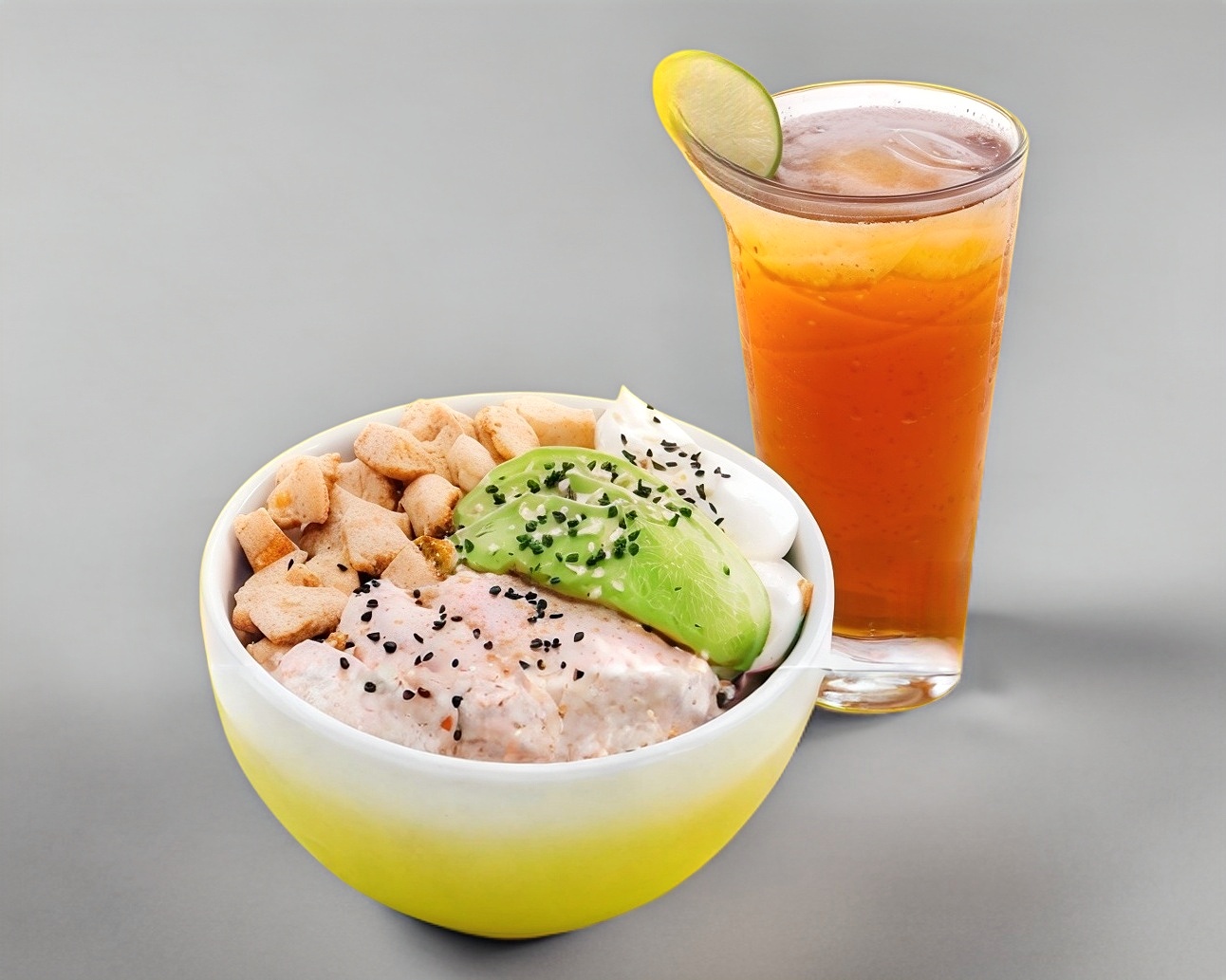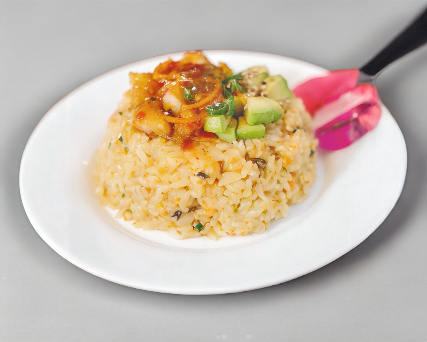 Arroz frito acompañado de carne arrachera y camarón crujiente, brócoli, morrón y julianas de tortilla tostada, acompañado de aguacate.