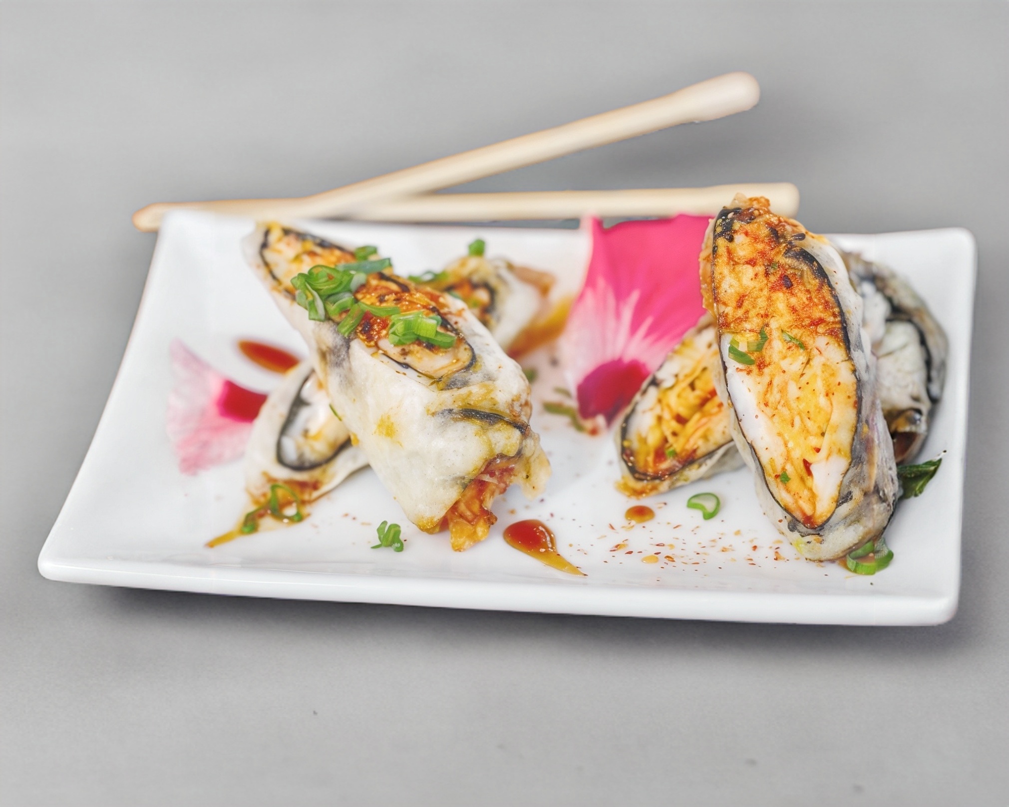 Sushi de 10 piezas. por dentro alga nori, salmon y pepino; por fuera queso philadelfia y aguacate, acompañado de mariscos gratinados.