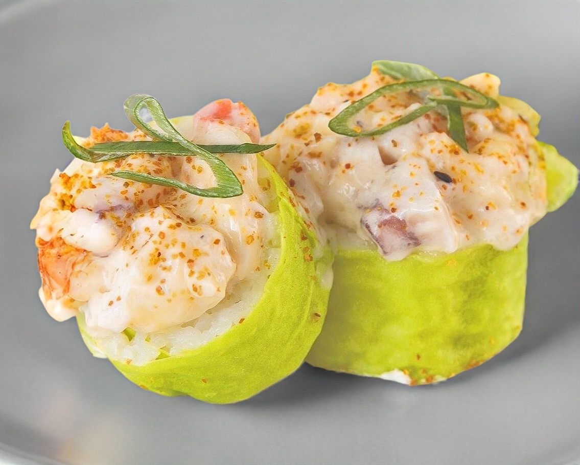 Sushi de 10 piezas, por dentro philadelfia, aguacate y pepino, por fuera alga nori capeado, coronado con topping de camarón, callo, aderezo spice y cebollín, bañado en sishimi ajonjolí y salsa de anguila.