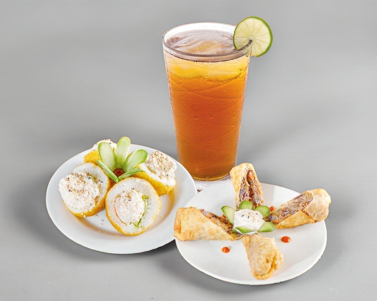 Sushi de 10 piezas, rollo empanizado, por dentro alga nori, camarón o surimi, pepino y aguacate, por fuera philadelfia y ensalada tampico.
