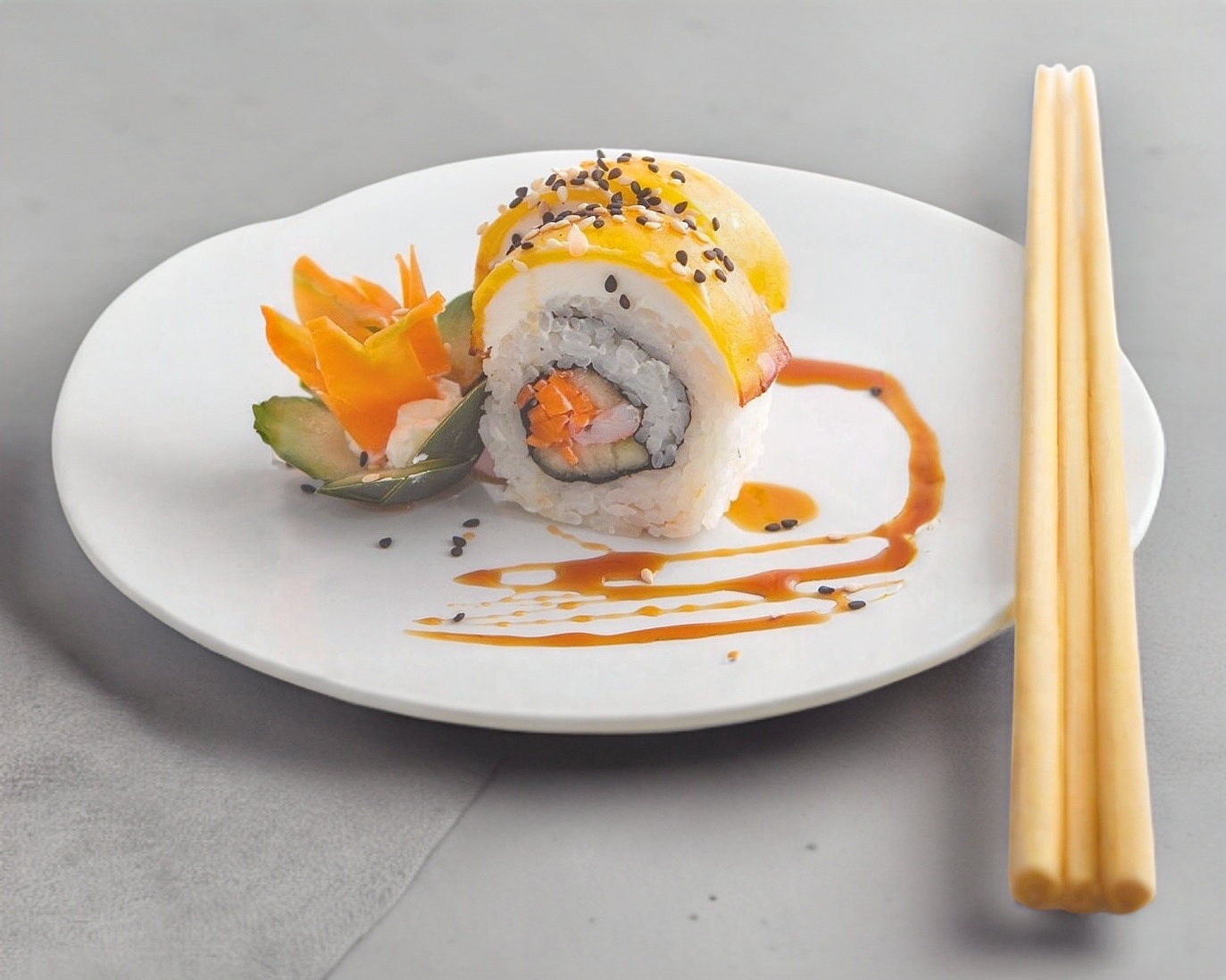 Sushi de 10 piezas, por dentro alga nori, pepino, surimi capeado; por fuera philadelfia y aguacate, coronado con topping de tampico, camarón empanizado y aderezo spice, bañado de anguila y ajonjolí.