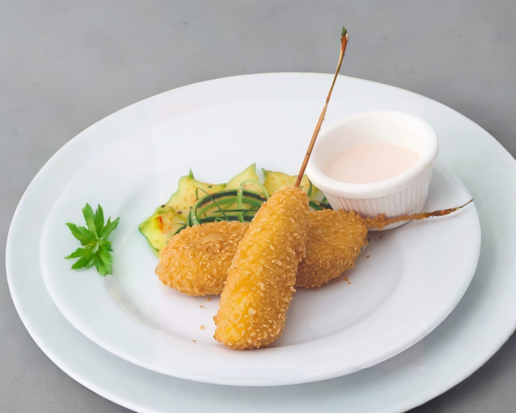 Rollo empanizado, por dentro alga nori, pepino, aguacate y surimi, por fuera queso philadelfia y coronado con ensalada de camarón con aderezo spice.