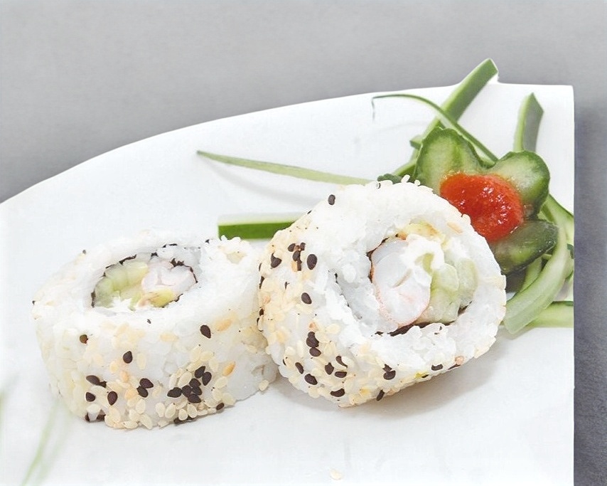 Rollo de 10 piezas, por dentro alga nori, pepino, aguacate, camarón o surimi, por fuera: philadelfia y ajonjolí.