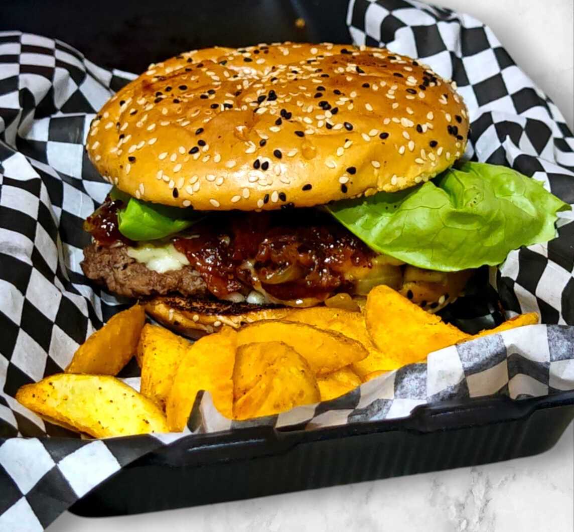 CARNE DE RES, QUESO AMERICANO, QUESO MOZARELLA, QUESO CHEDAR, MERMELADA DE TOCINO