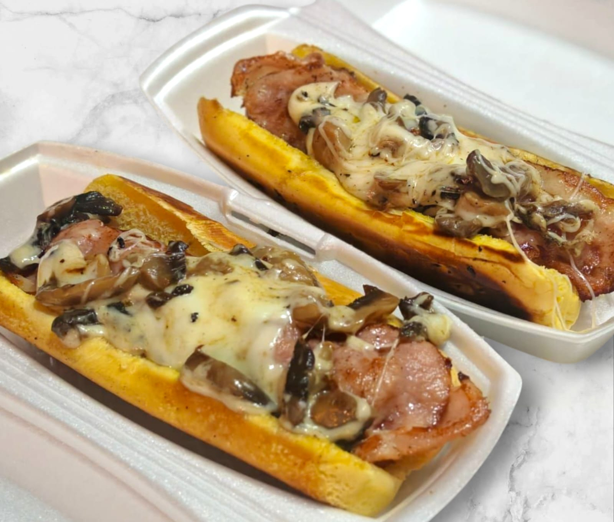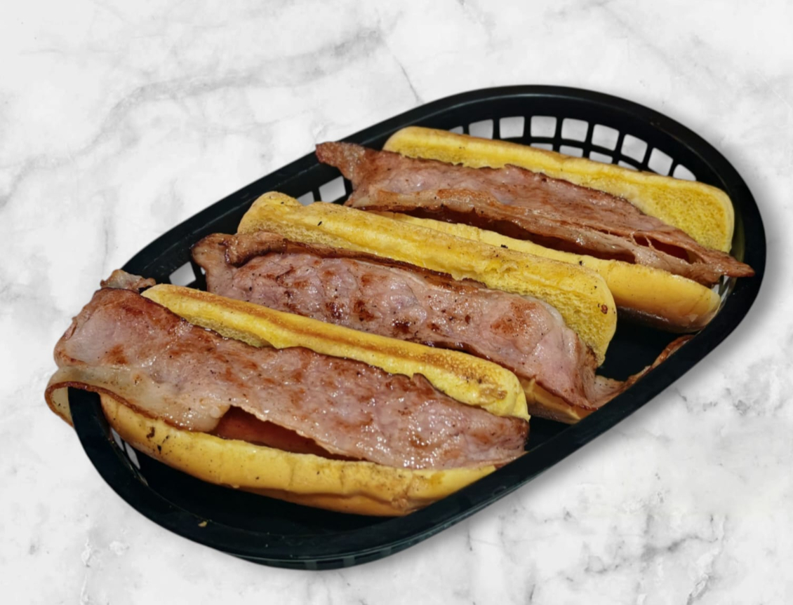Pan, salchicha para asar, extra queso, mermelada de tocino y tocino