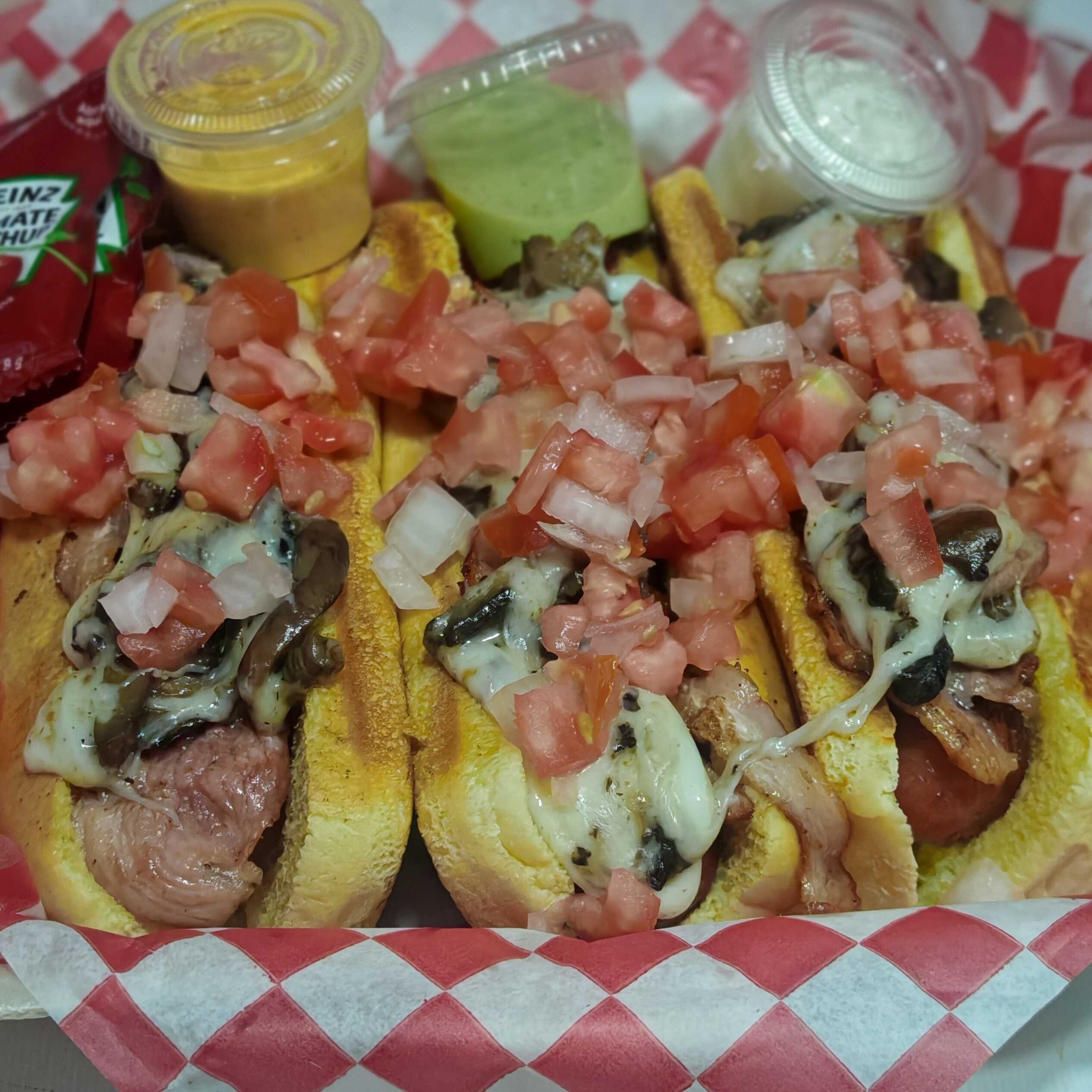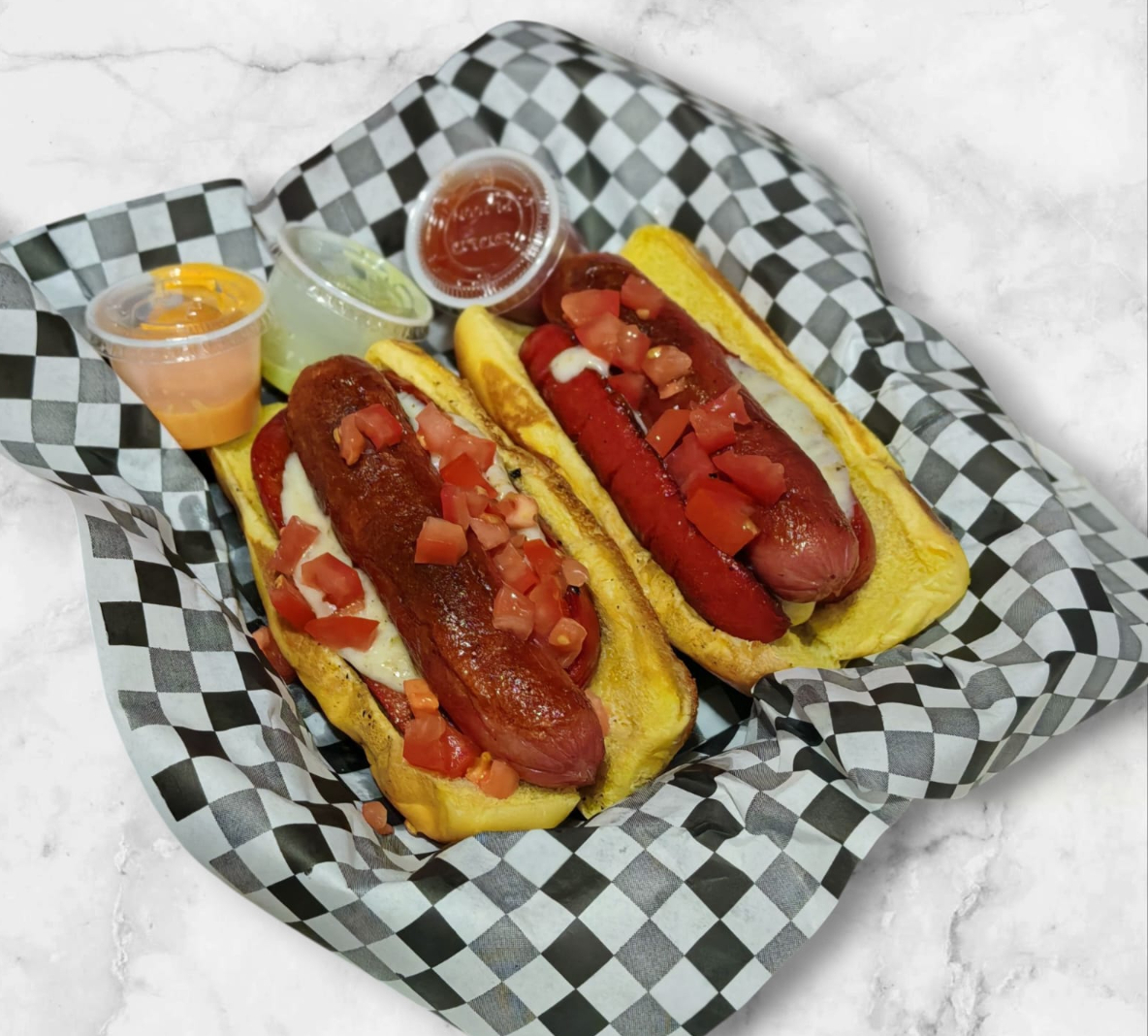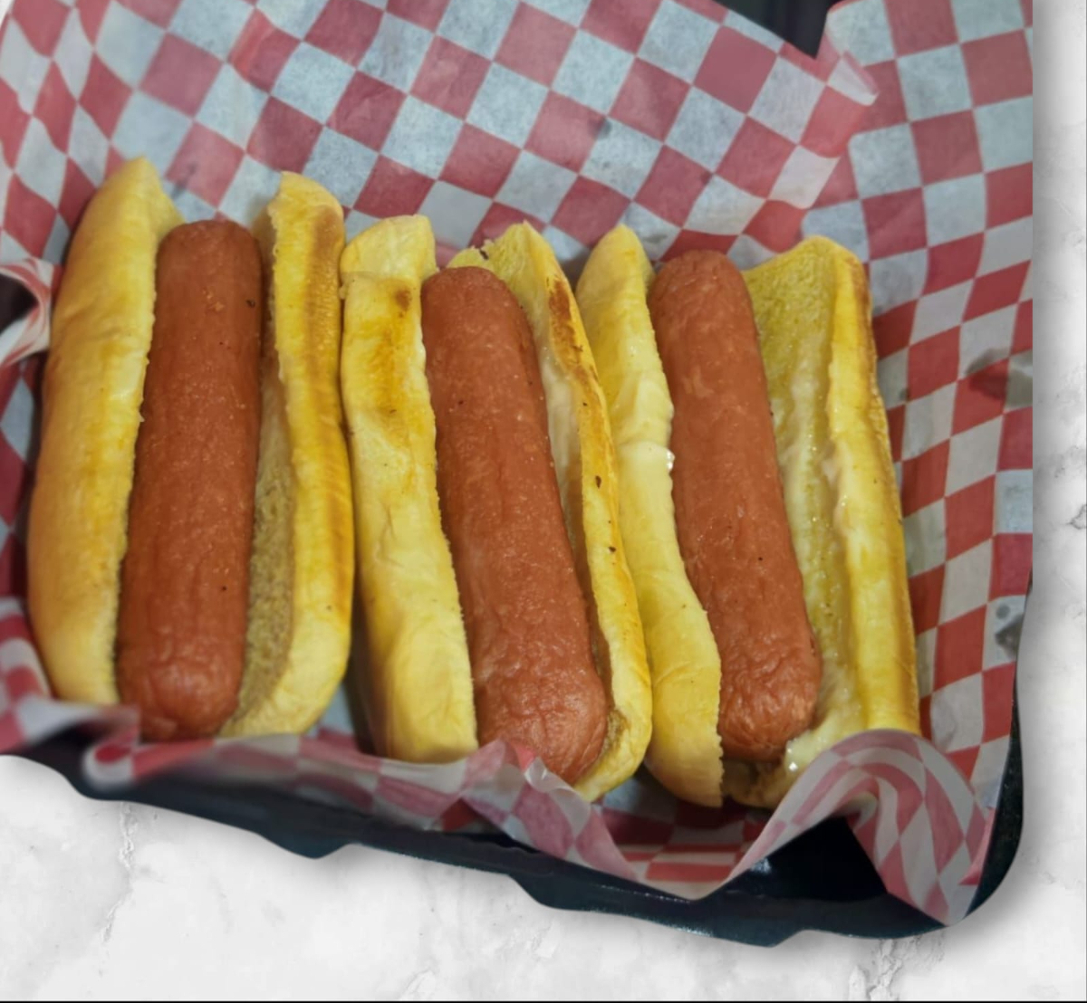 3 Dogos clásicos con salchicha, acompañado de jitomate y cebolla por separado si lo deseas.