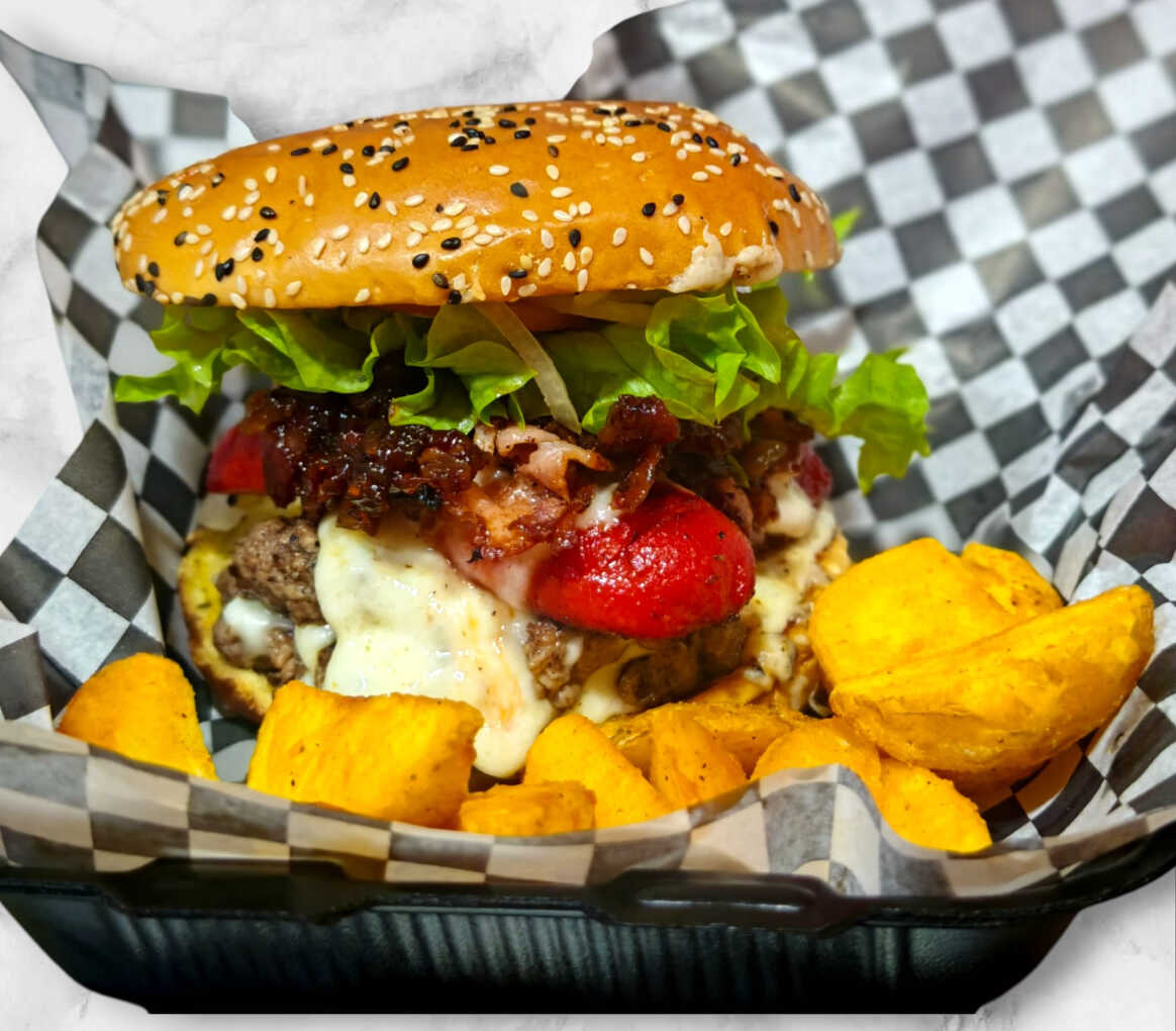 DOBLE CARNE DE RES, QUESO AMERICANO, QUESO MOZZARELLA, ADEREZO JUMI, MERMELADA DE TOCINO, SALCHICHA PARA ASAR