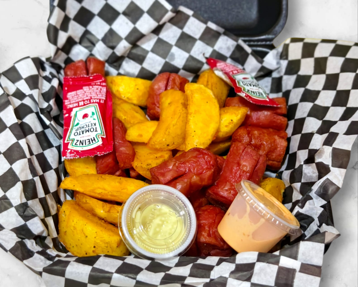 CARNE DE RES, QUESO MOZZARELLA, ADEREZO JUMI, CAMAR INCLUYE PAPAS ONES