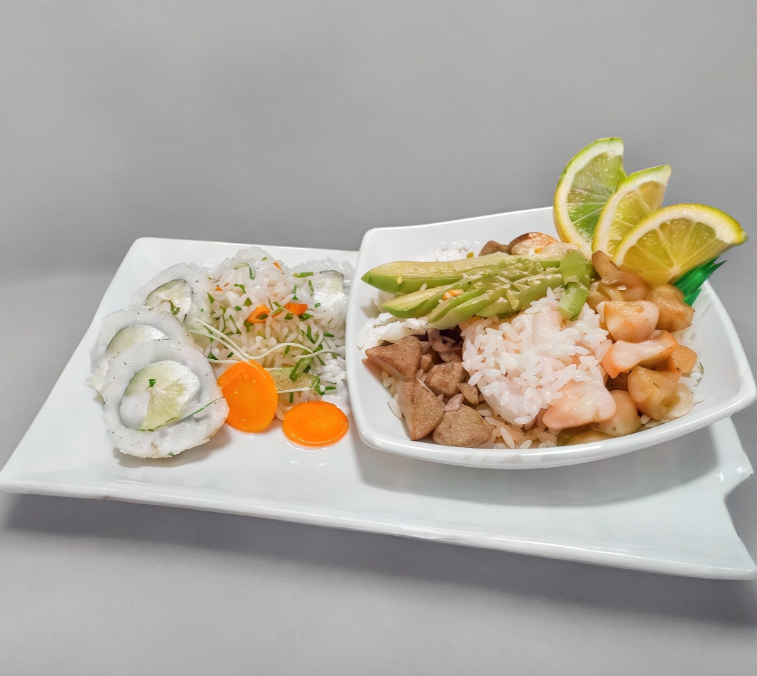Arroz al vapor. Especial incluye Philadelphia, aguacate y ensalada de surimi.